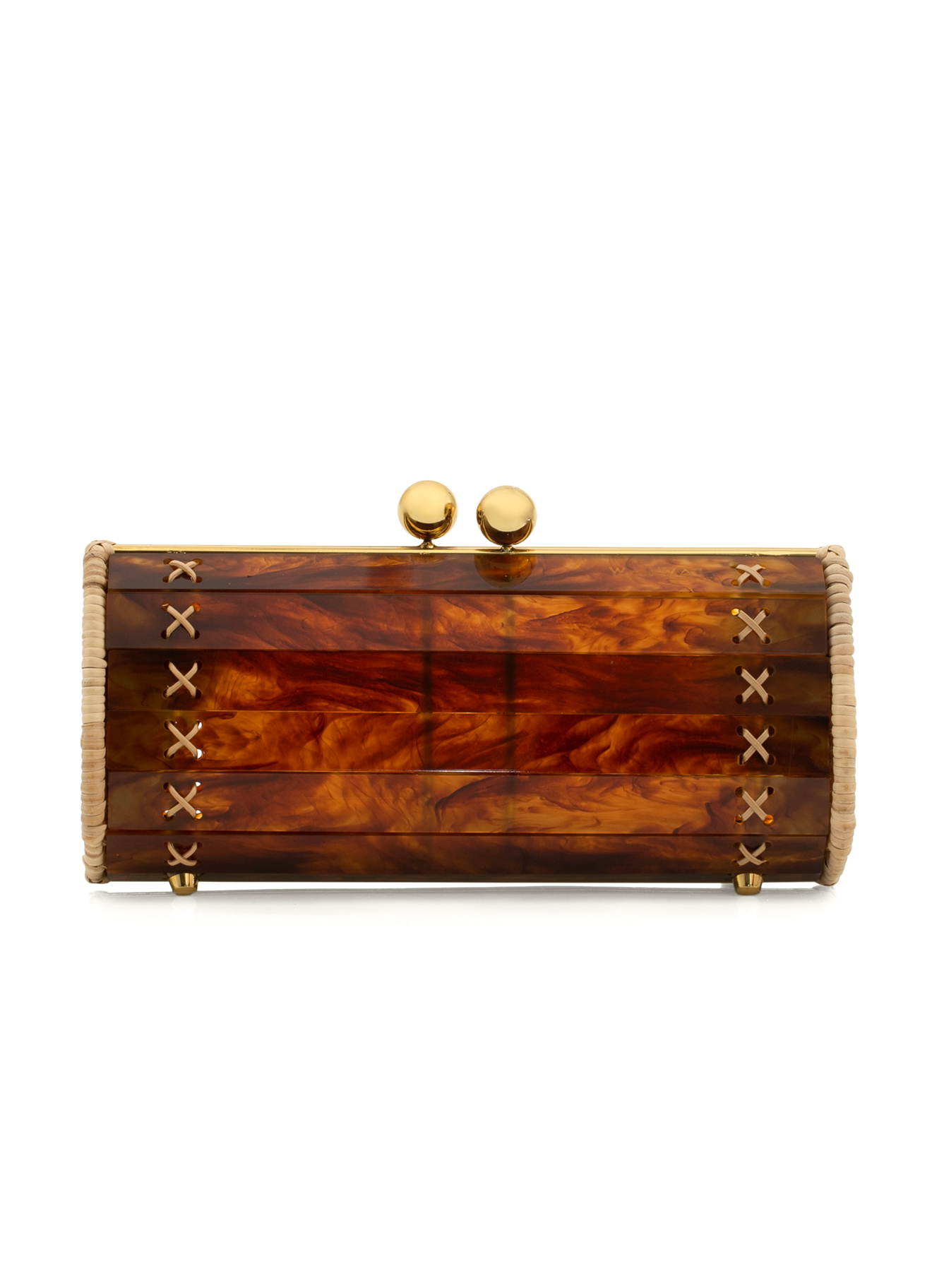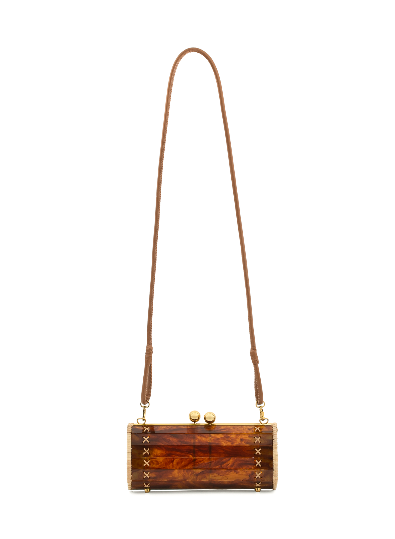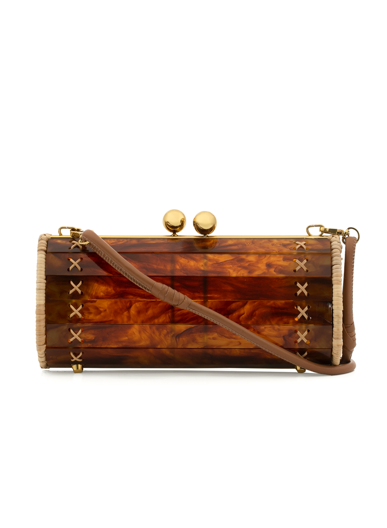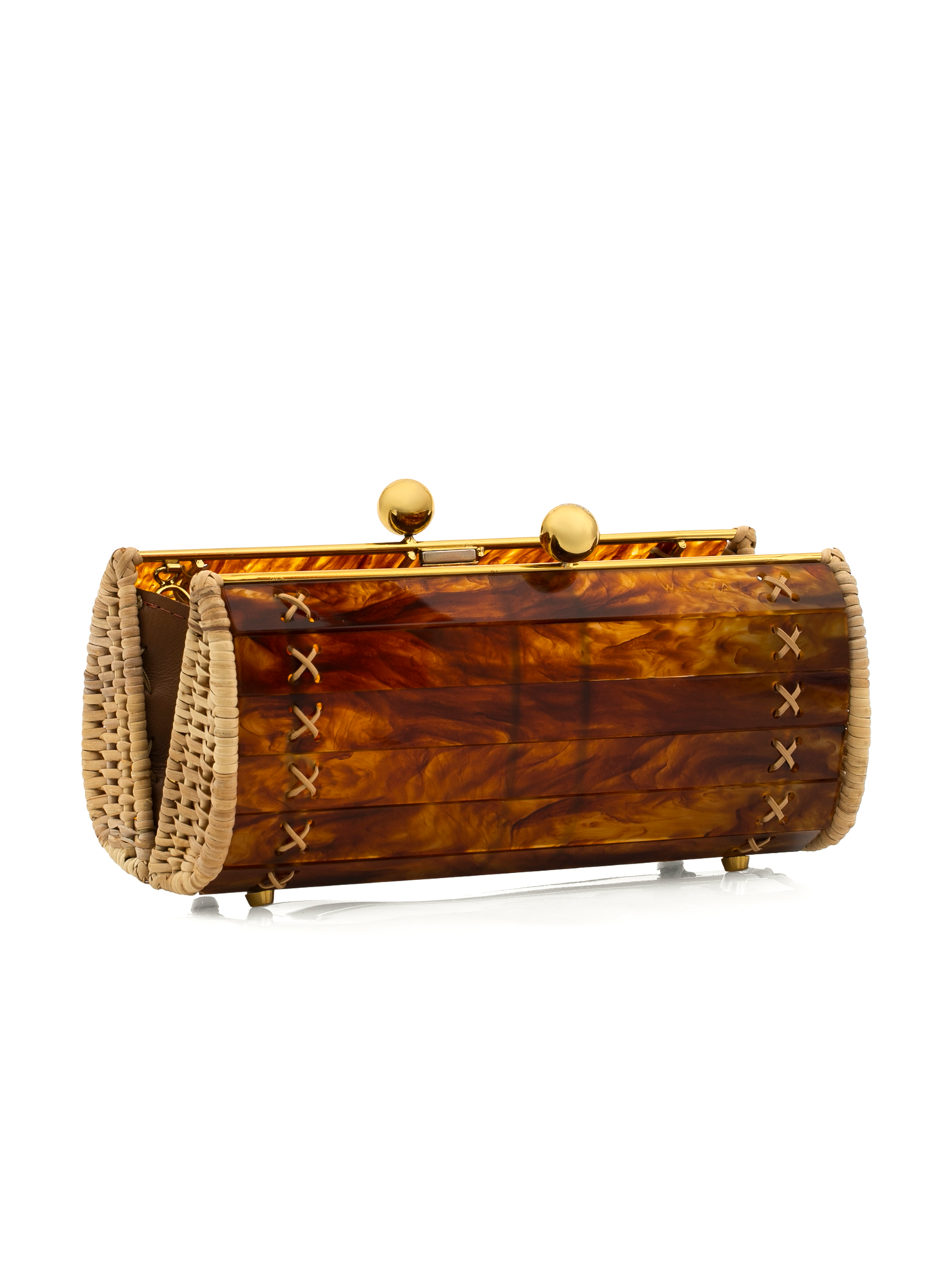 Handwoven rattan and acrylic clutch bag. Removable leather shoulder strap. Can be used as a shoulder bag, crossbody or handbagwidth, depth, height