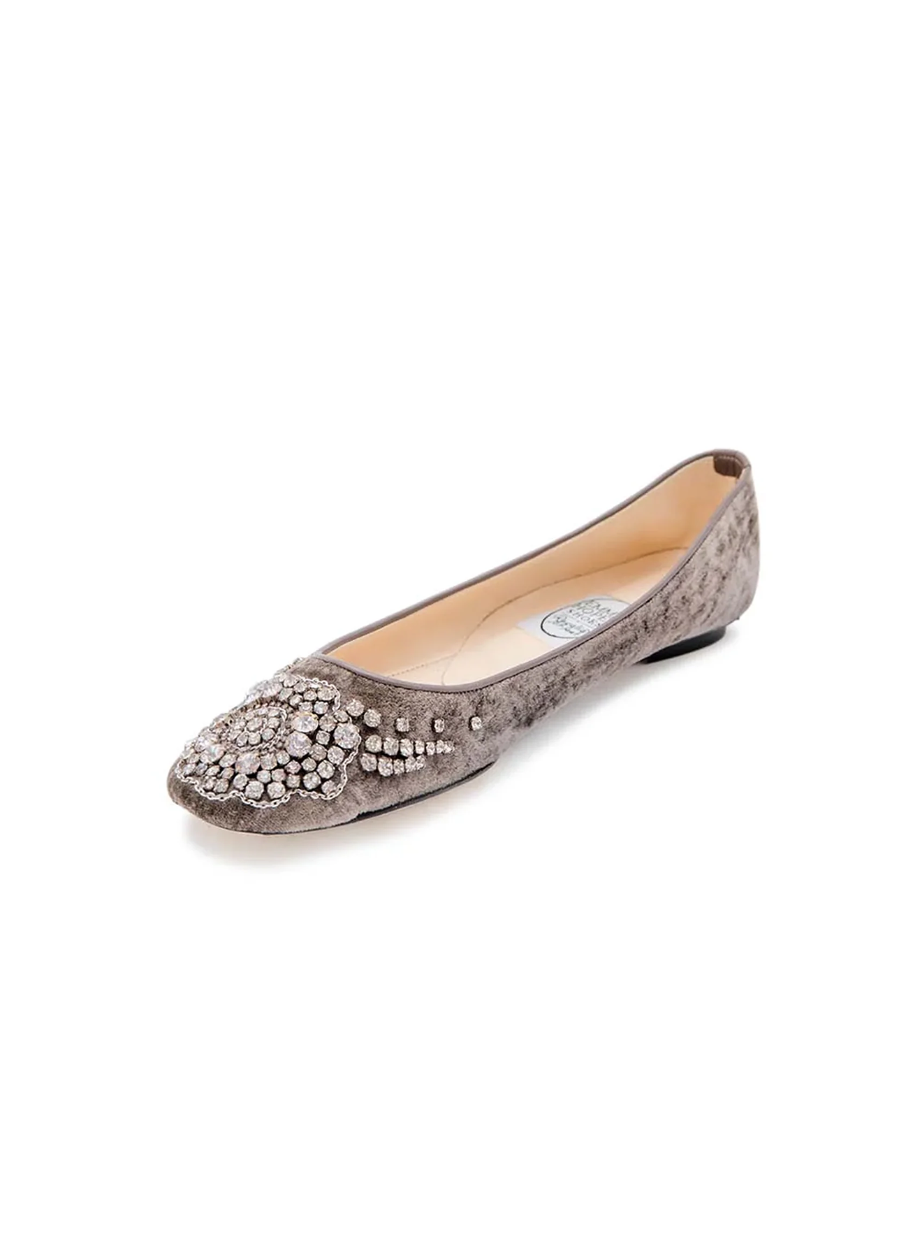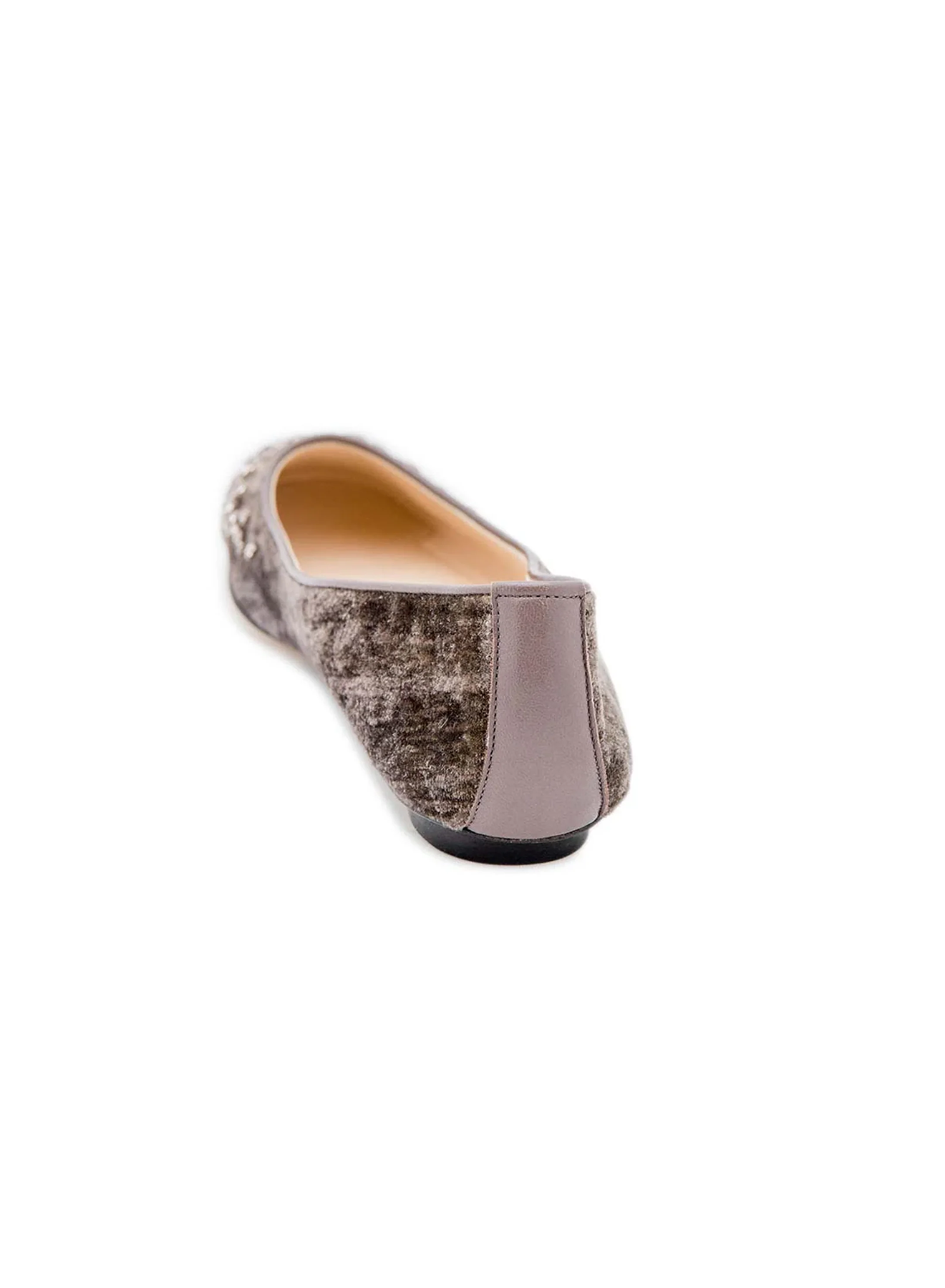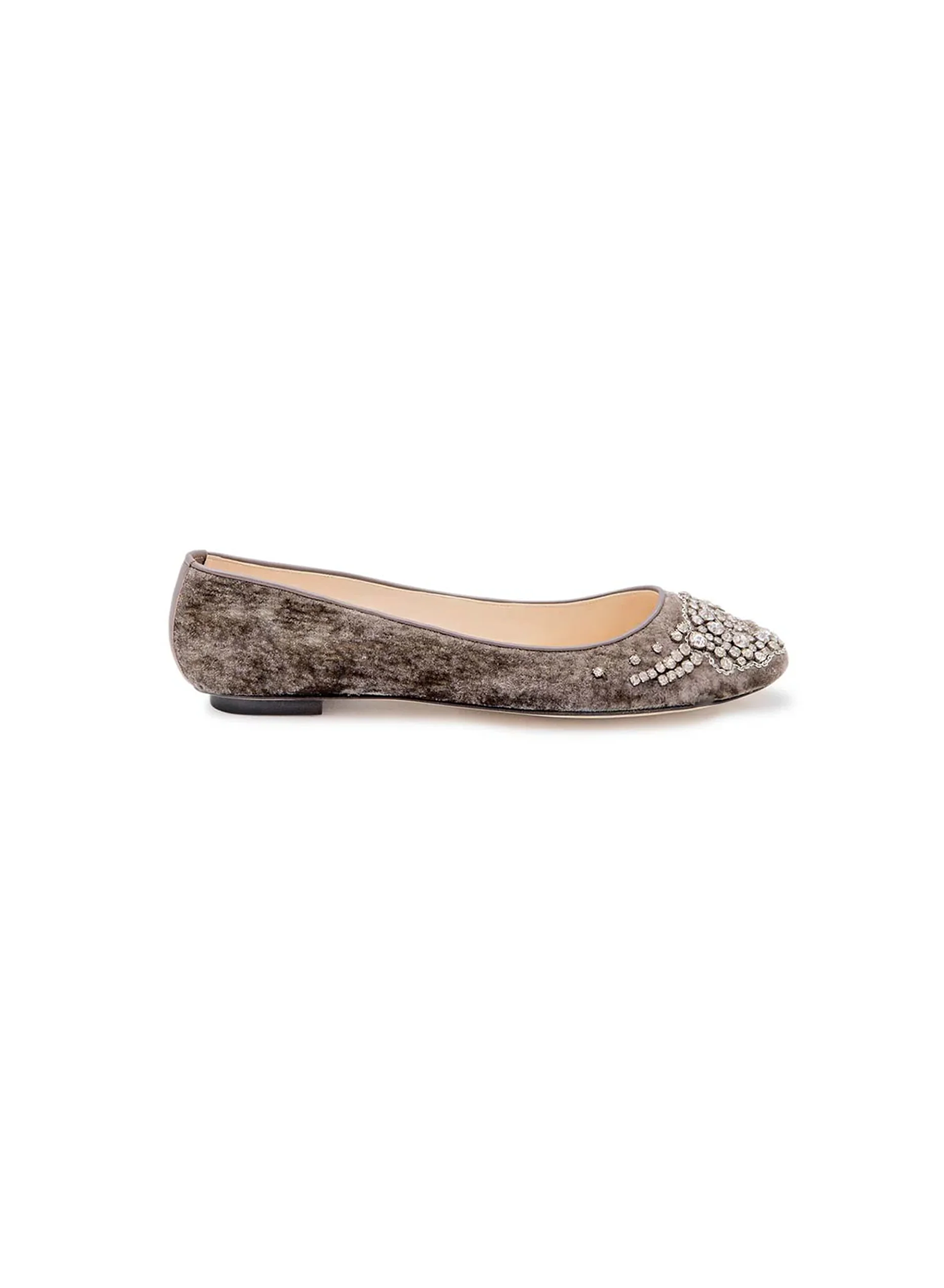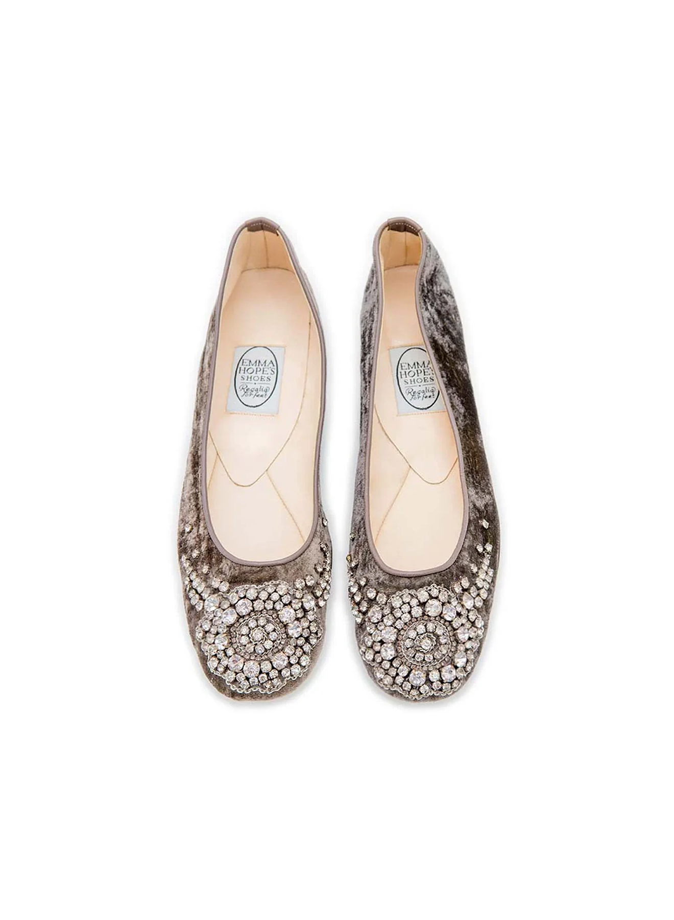 Regular price$ 576.00Grey silk velvet chisel toe ballet encrusted with diamond paste crystals and hand stitched chain detail on a 10mm flat heel.