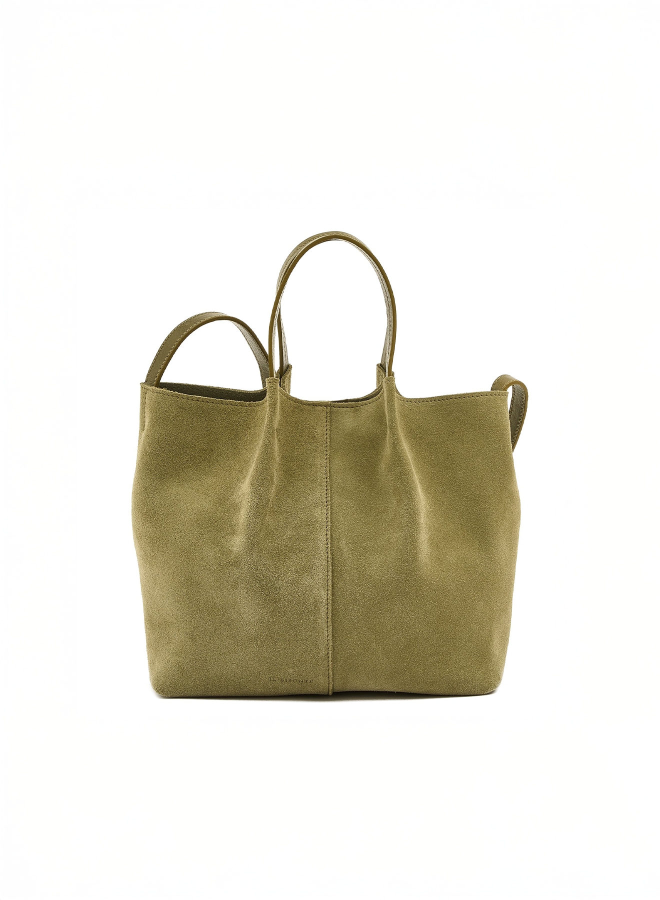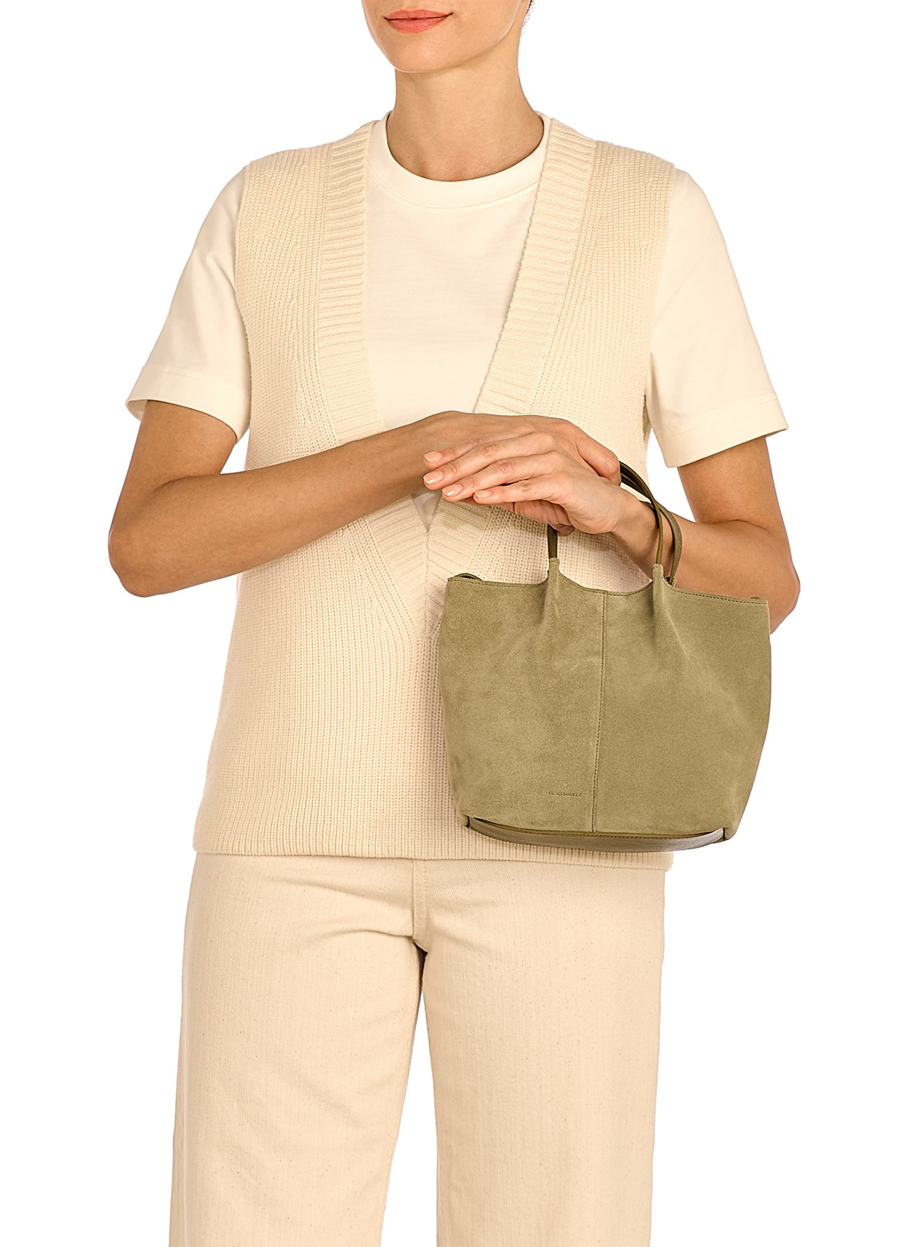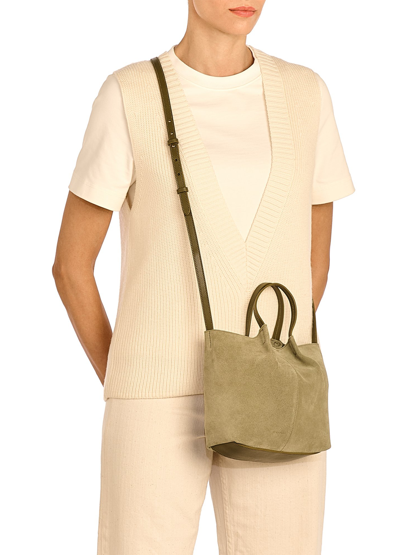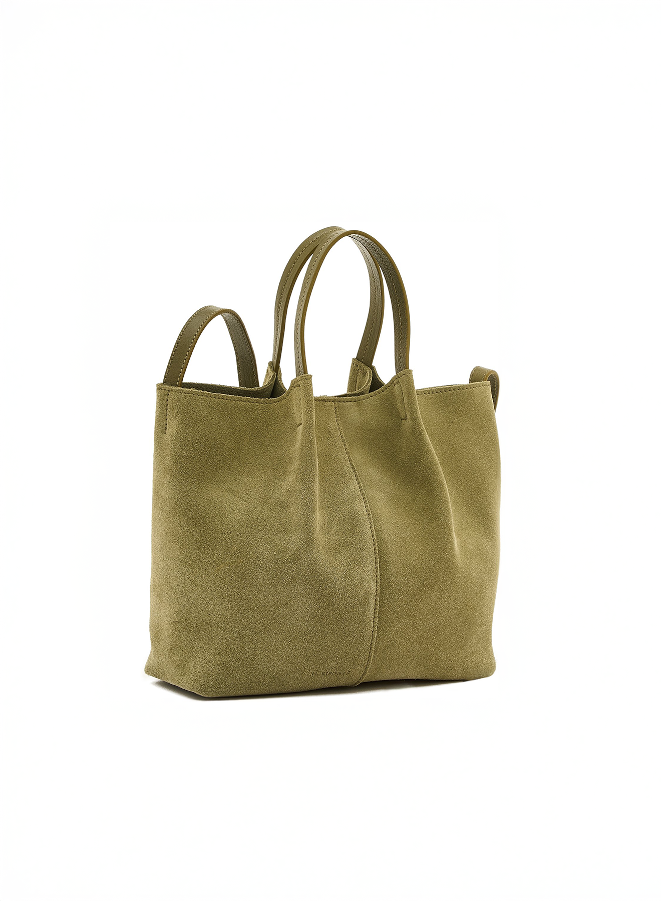 Small tote bag with an essential, timeless design defined by supple vegetable-tanned leather and soft pleats. Shoulder strap can be adjusted with stud. Pleats hand-stitched in place. Snap button closure. Lined in suede. 100% made in Italy.