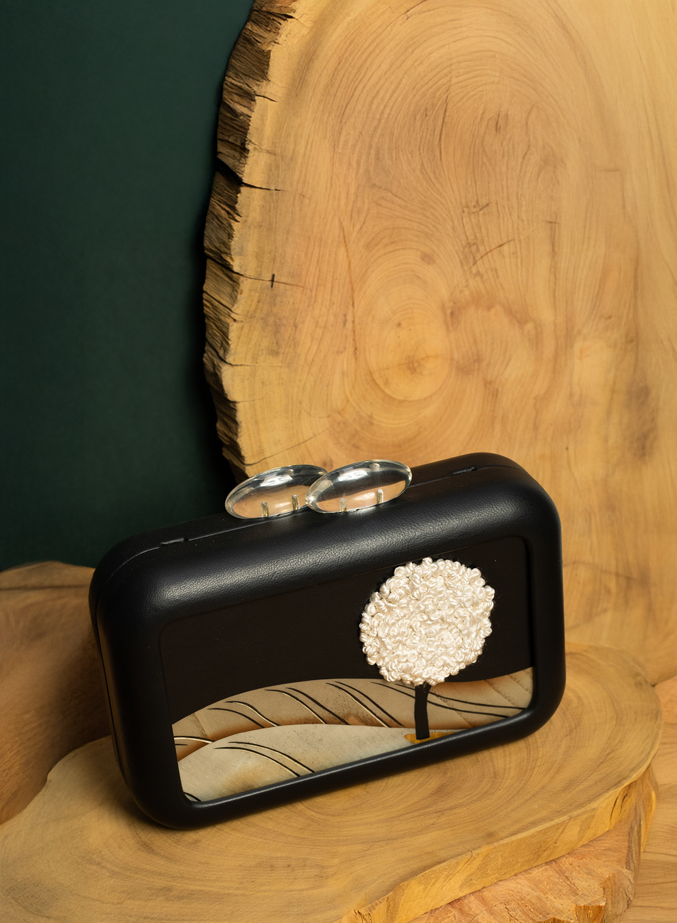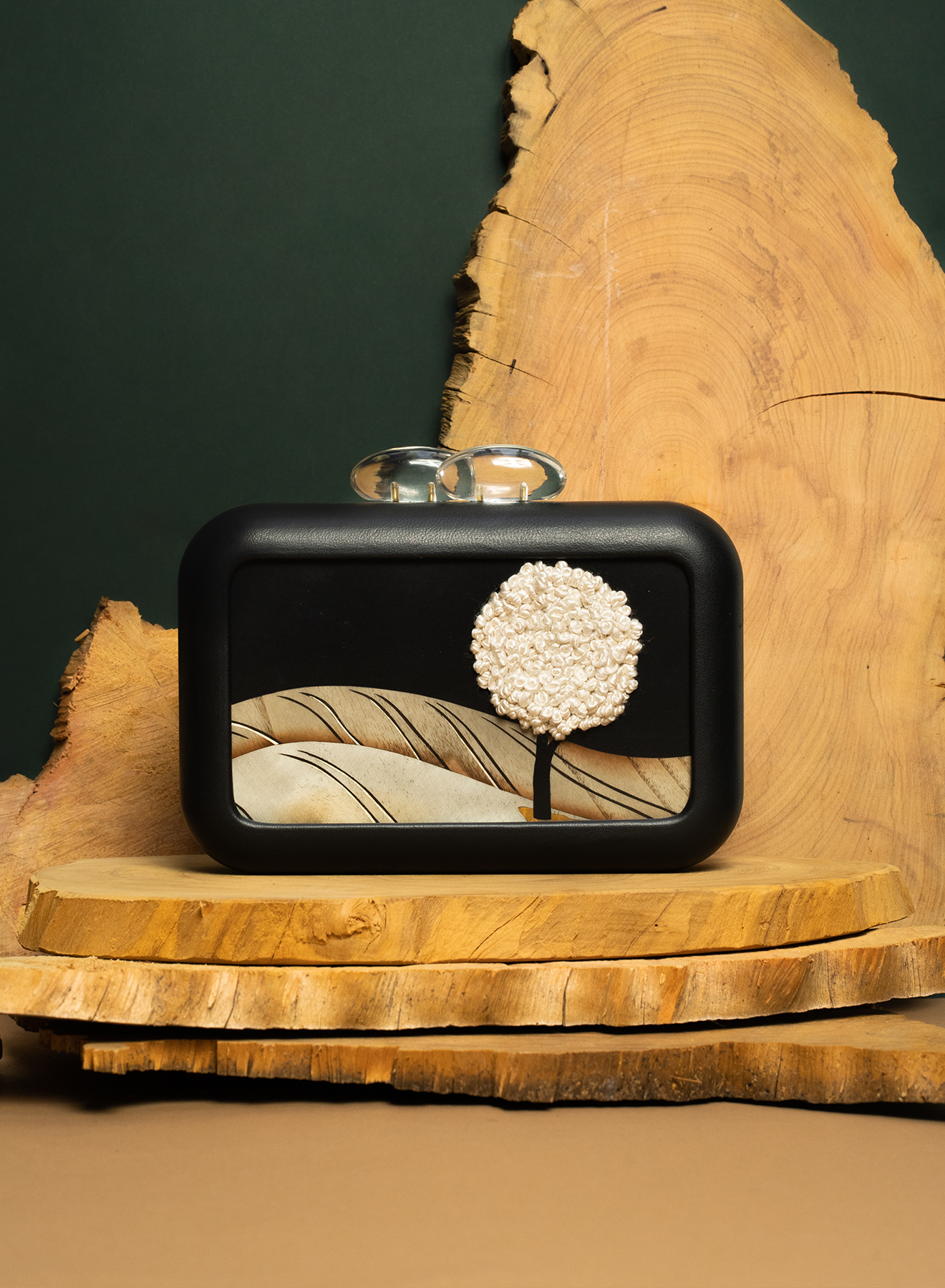 Handcrafted clutch bag with marquetry plaque and silk embroidery detail, clear acrylic clasp and removable black plissé silk strap, leather coated frame, magnetic fastening, suede lining, ships with a velvet dust bag.