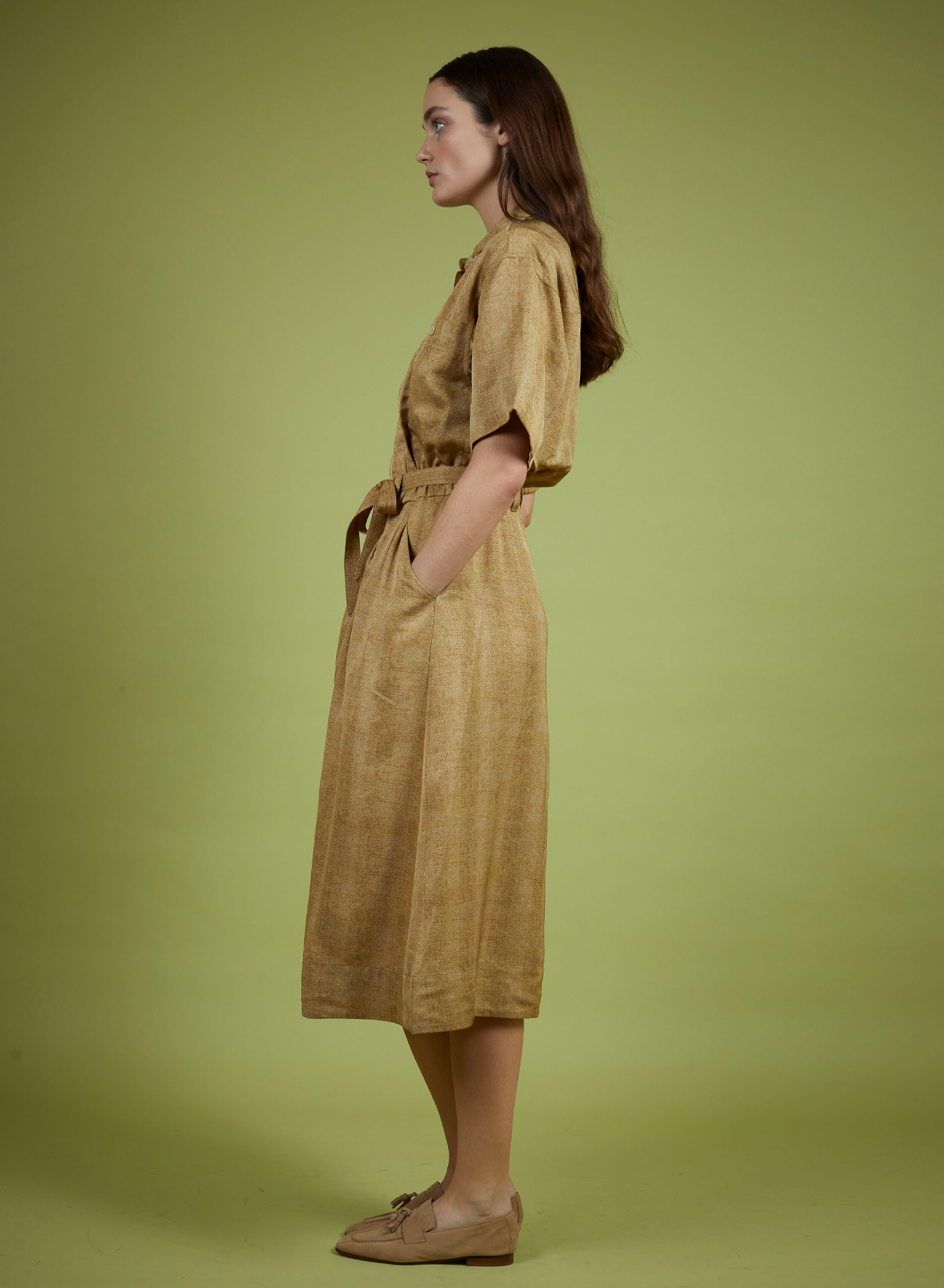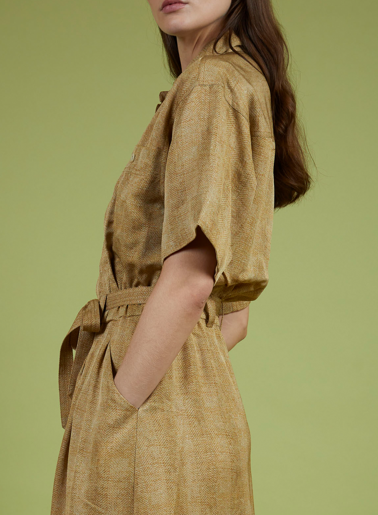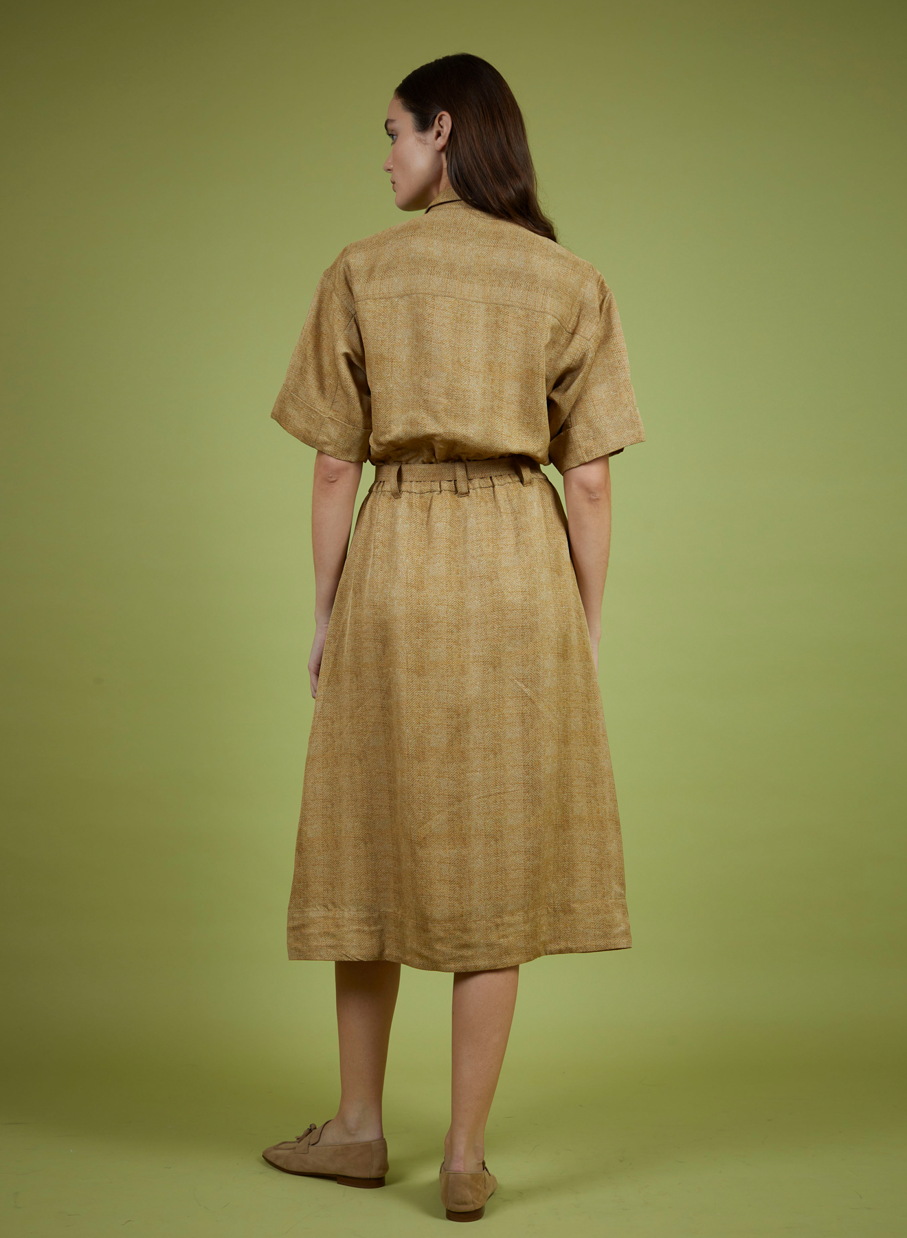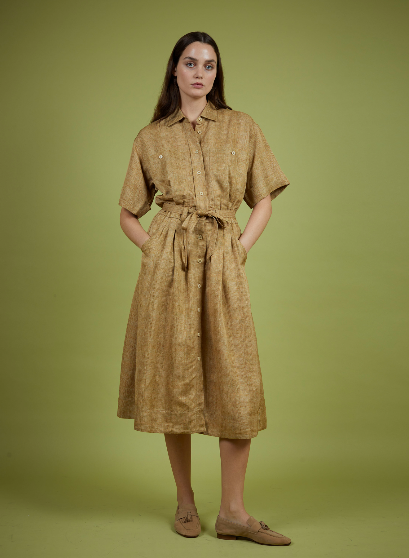Short sleeve shirt dress finished with a tie at the waist.