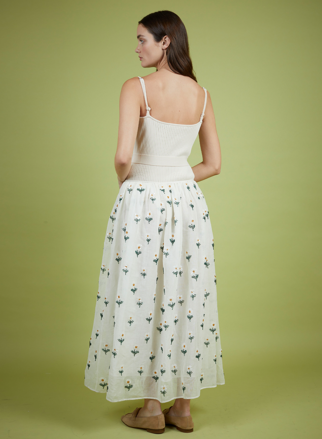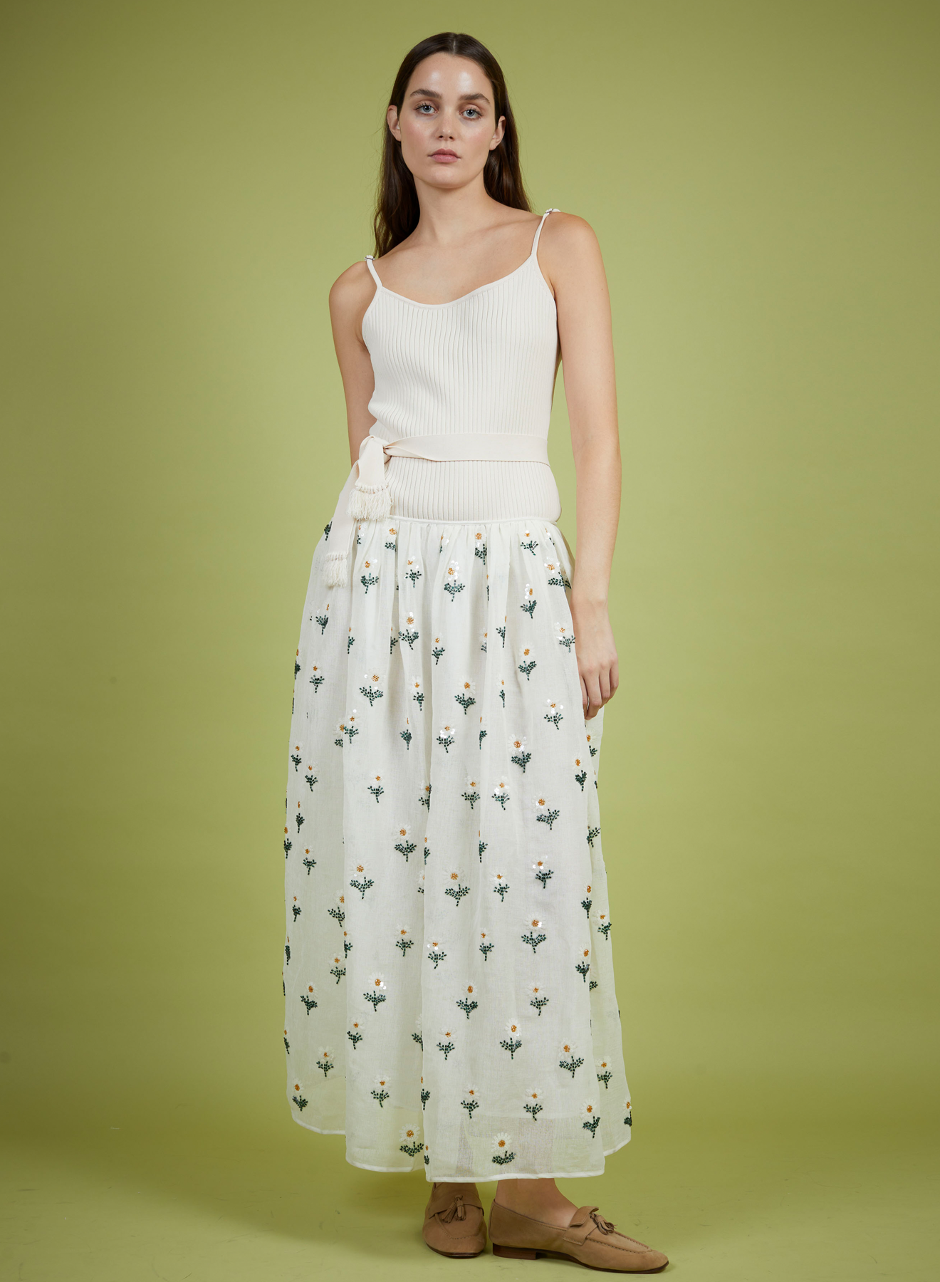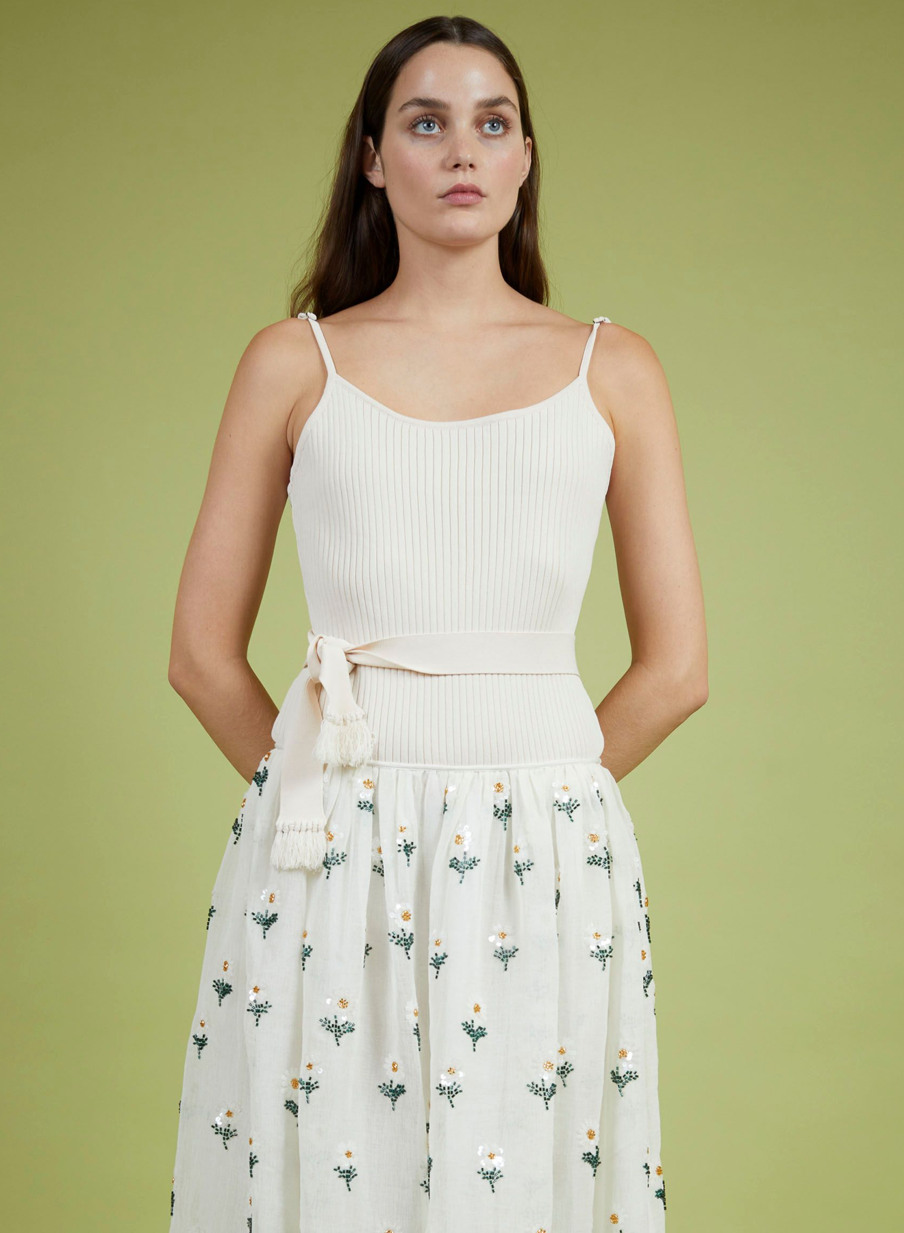Midi dress with a ribbed knit bodice, delicate straps, and a flowy embroidered skirt, finished with a waist tie for a feminine shape