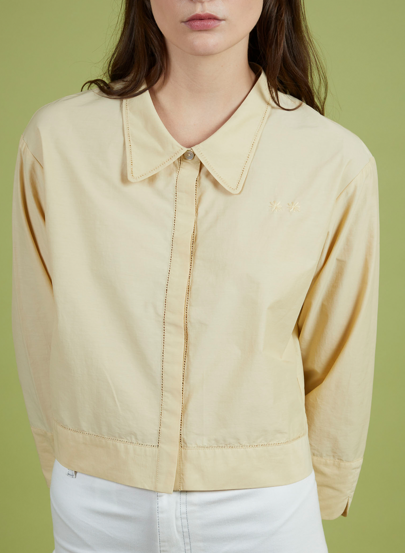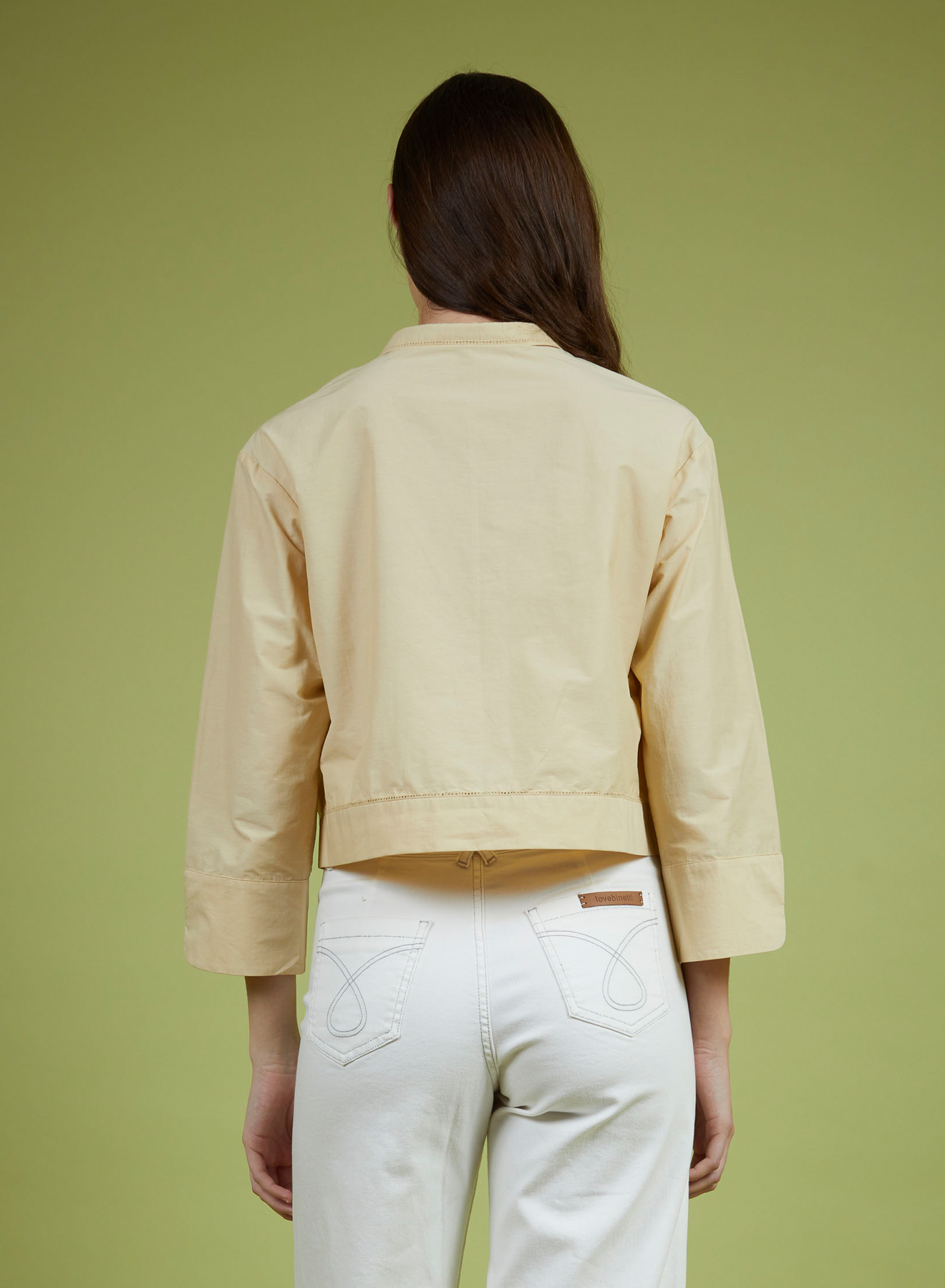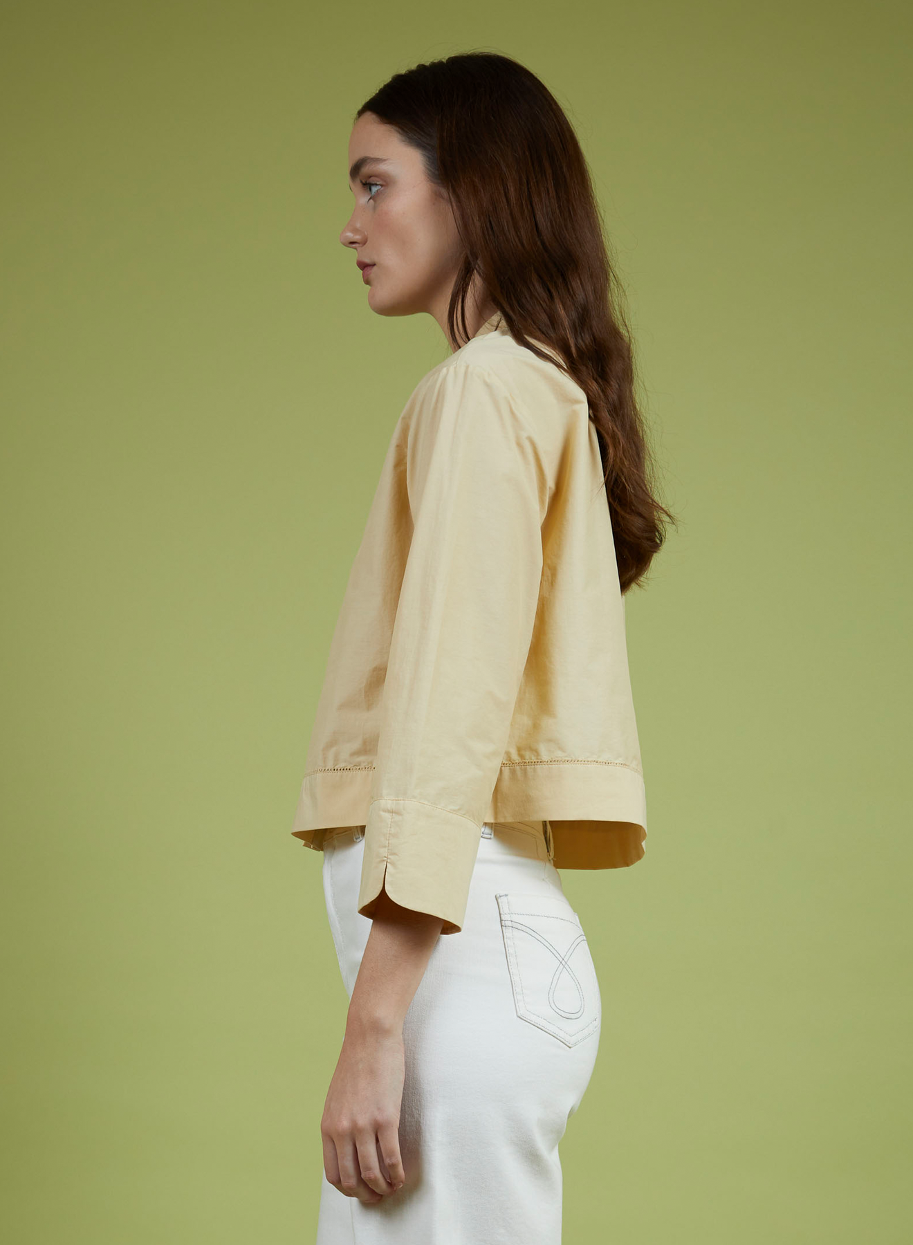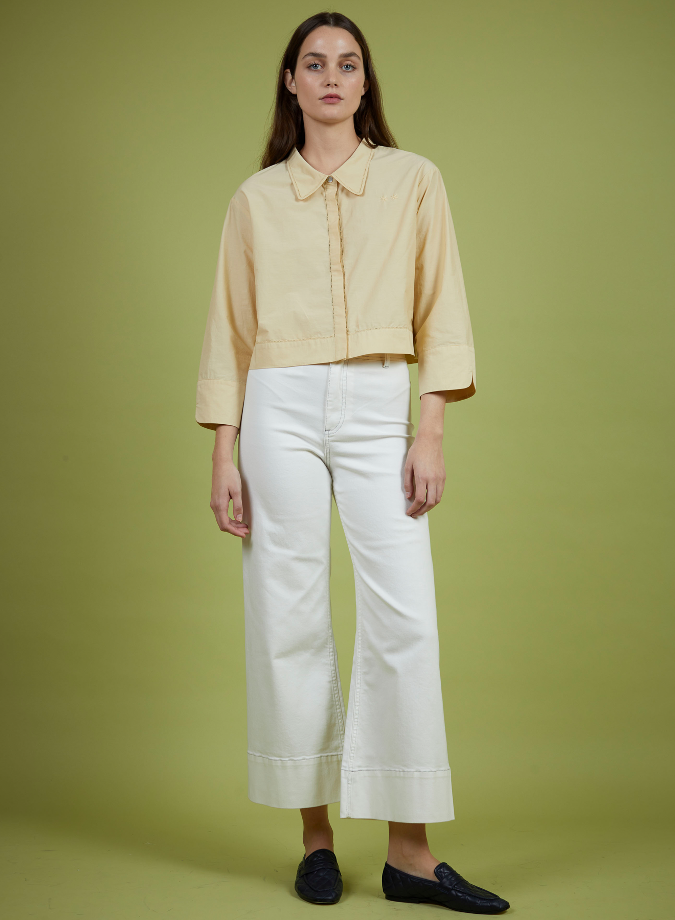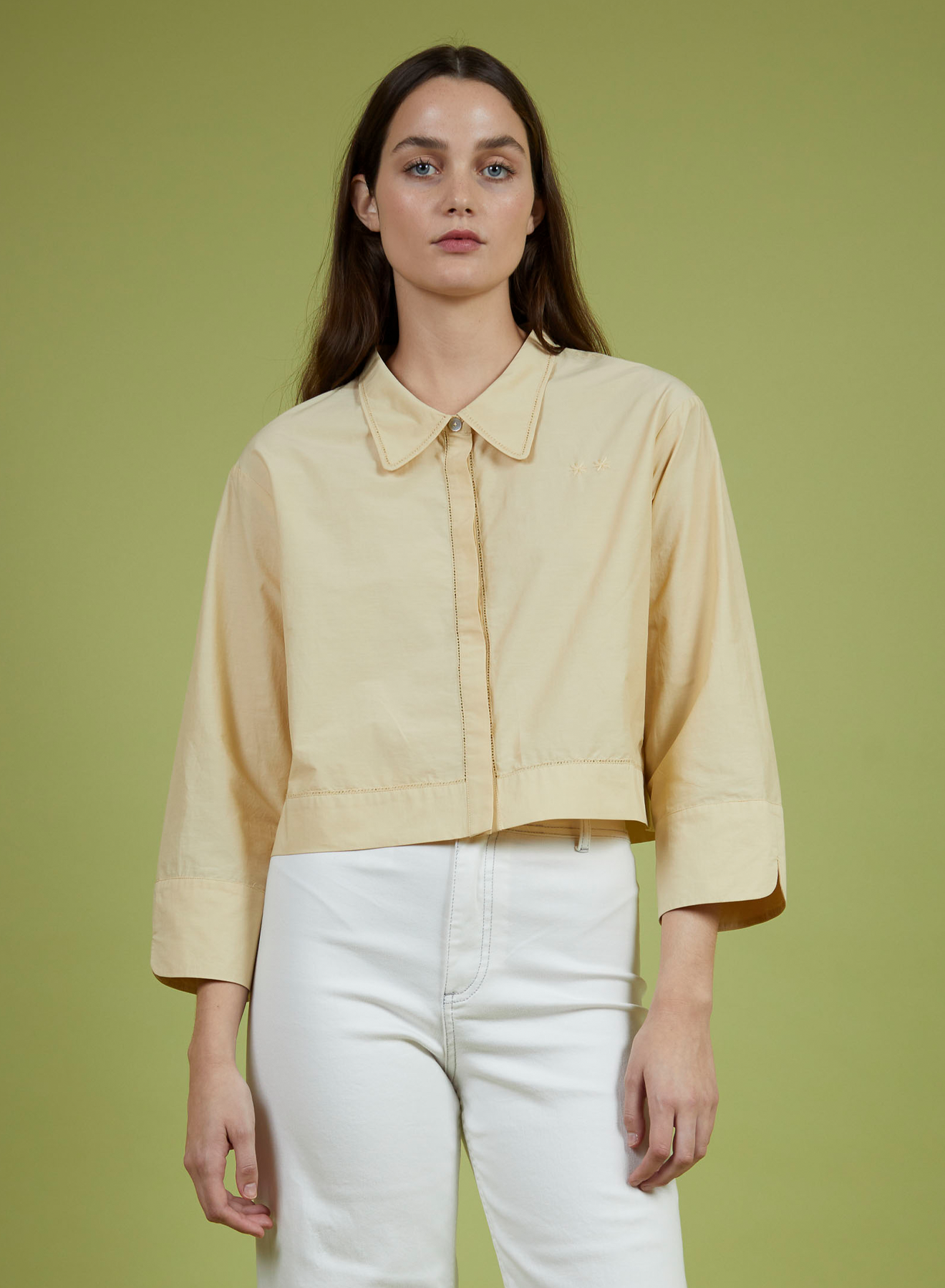 Classic collar shirt with hidden button placket, and relaxed three-quarter sleeves