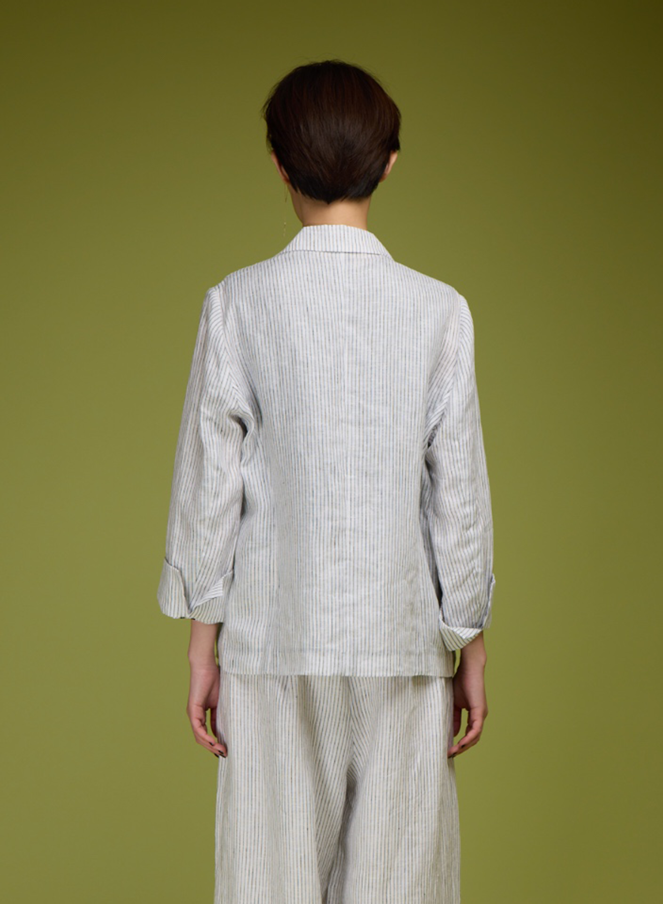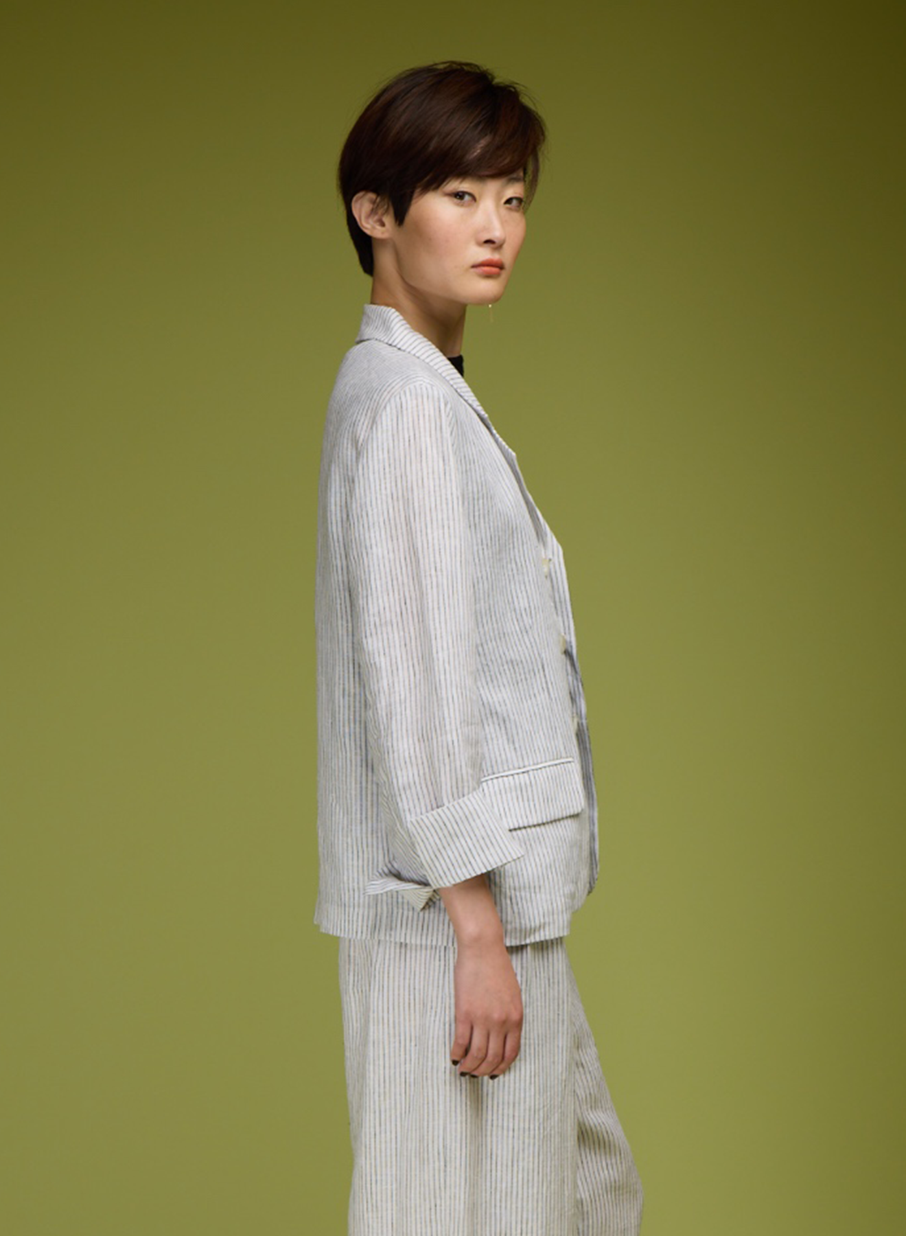 A striped blazer finished with natural buttons and a softly relaxed collar