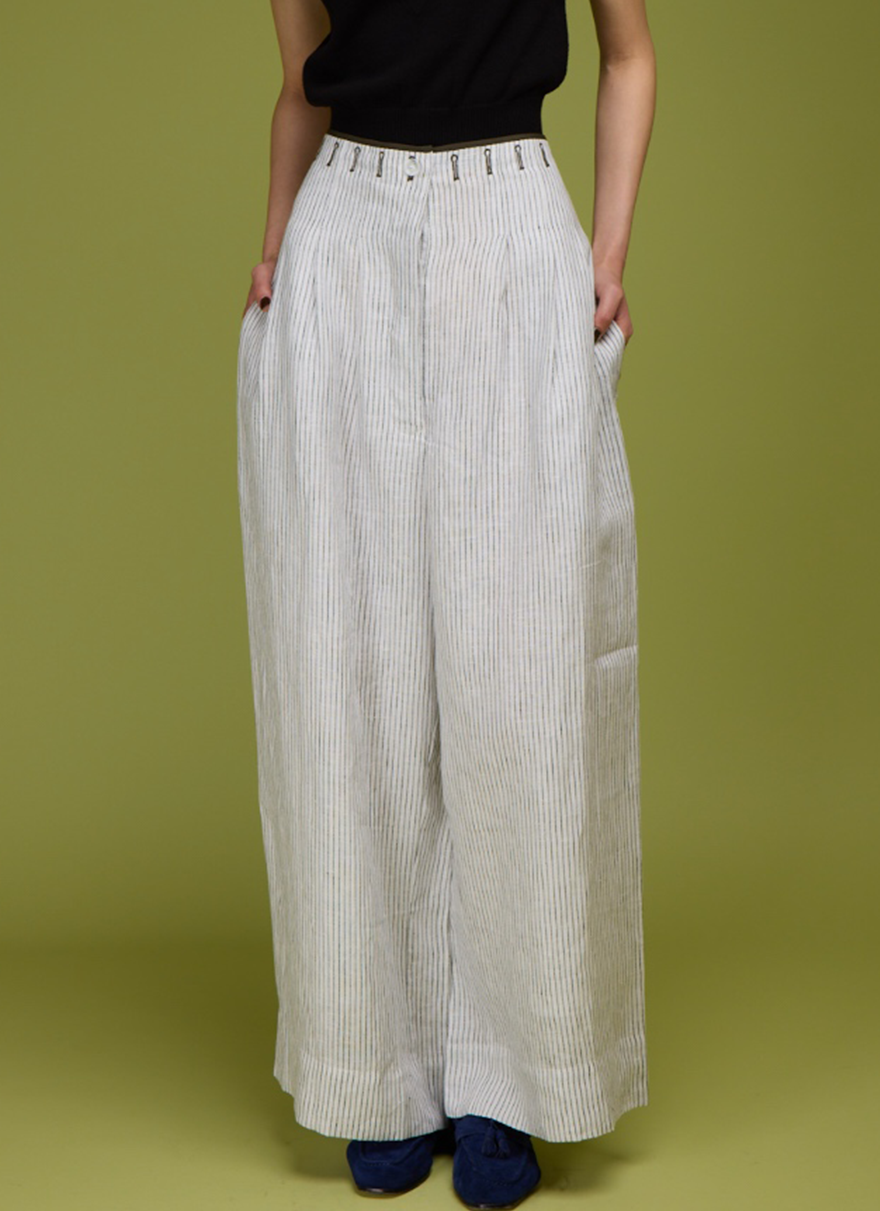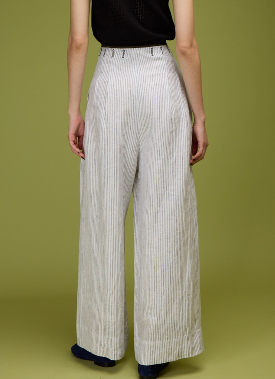 Striped flowy pants adorned with delicate black embroidery at the waist