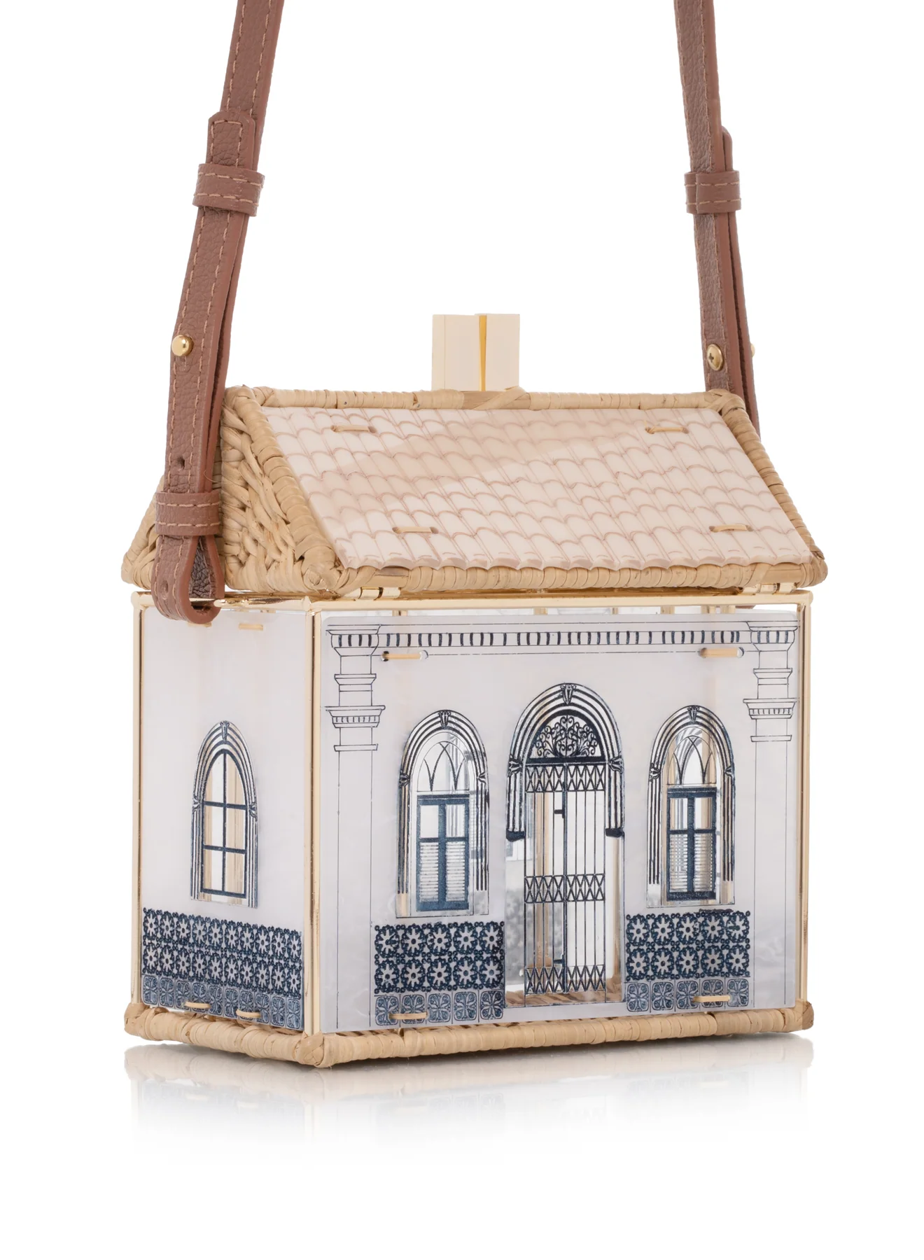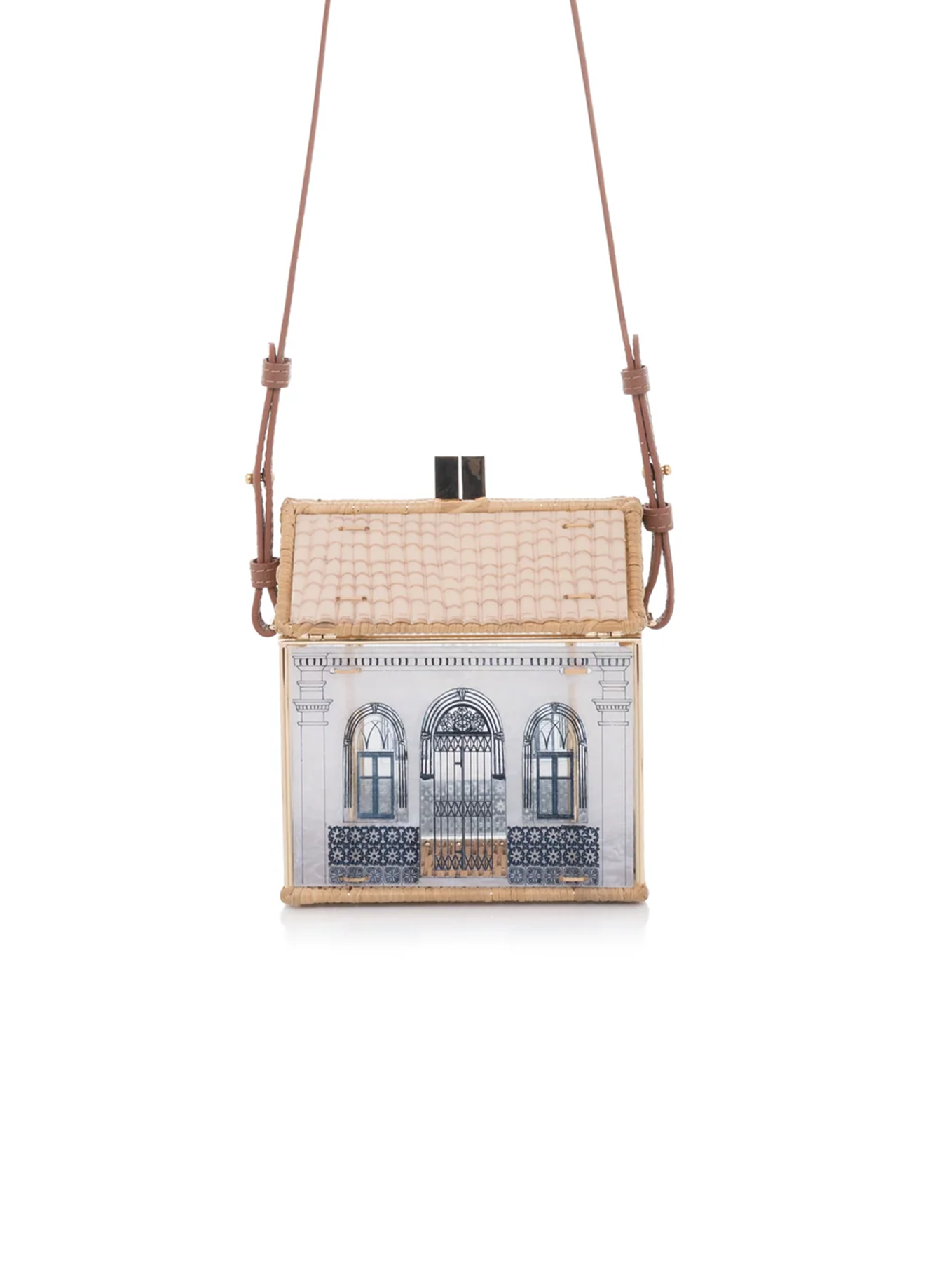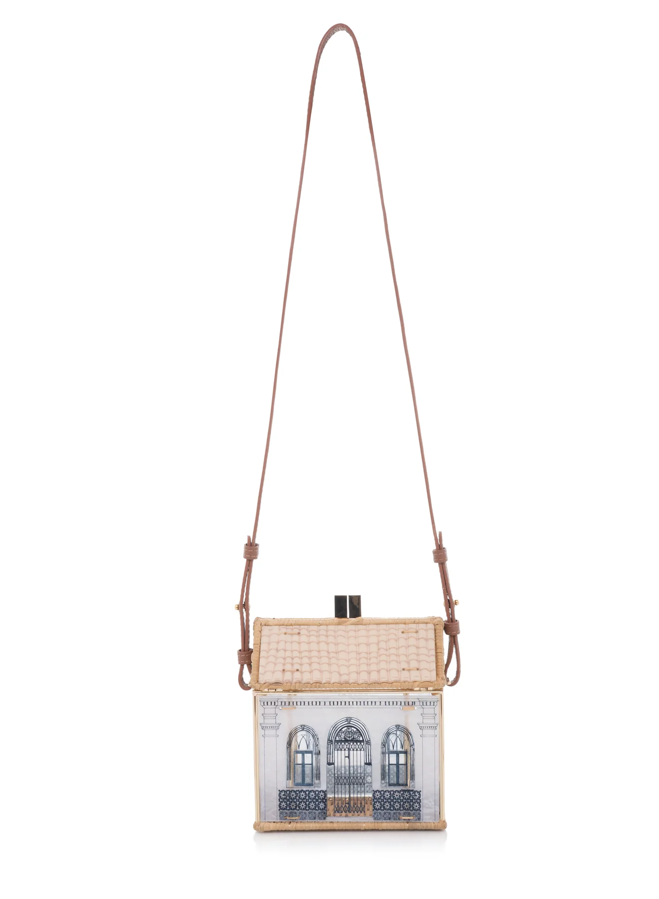 The Uxua Bag Paraty is a standout hexagonal bag with a gold-plated metal frame and handwoven rattan details. It features acrylic panels with typical homes-themed designs and comes with a leather top handle and a detachable strap for versatile wear.