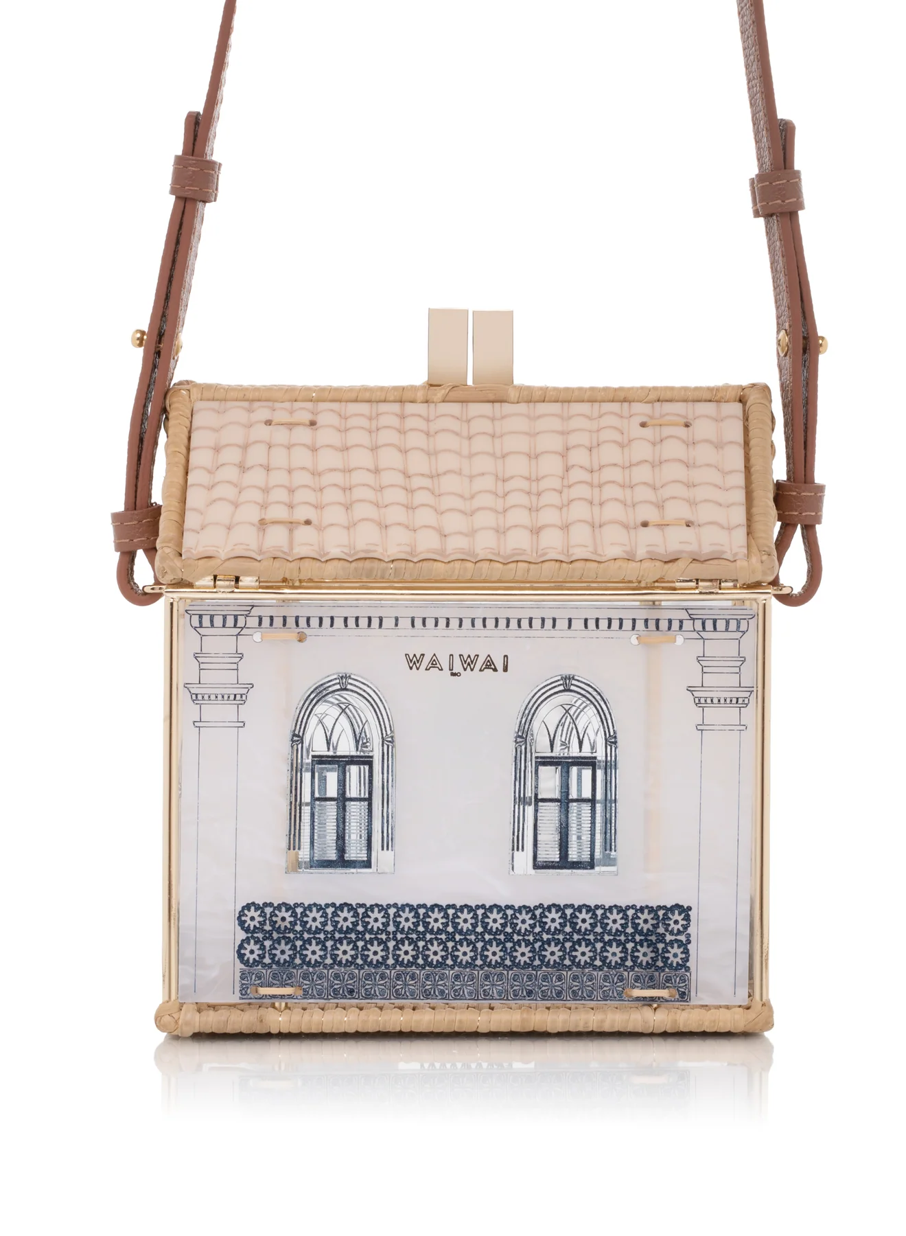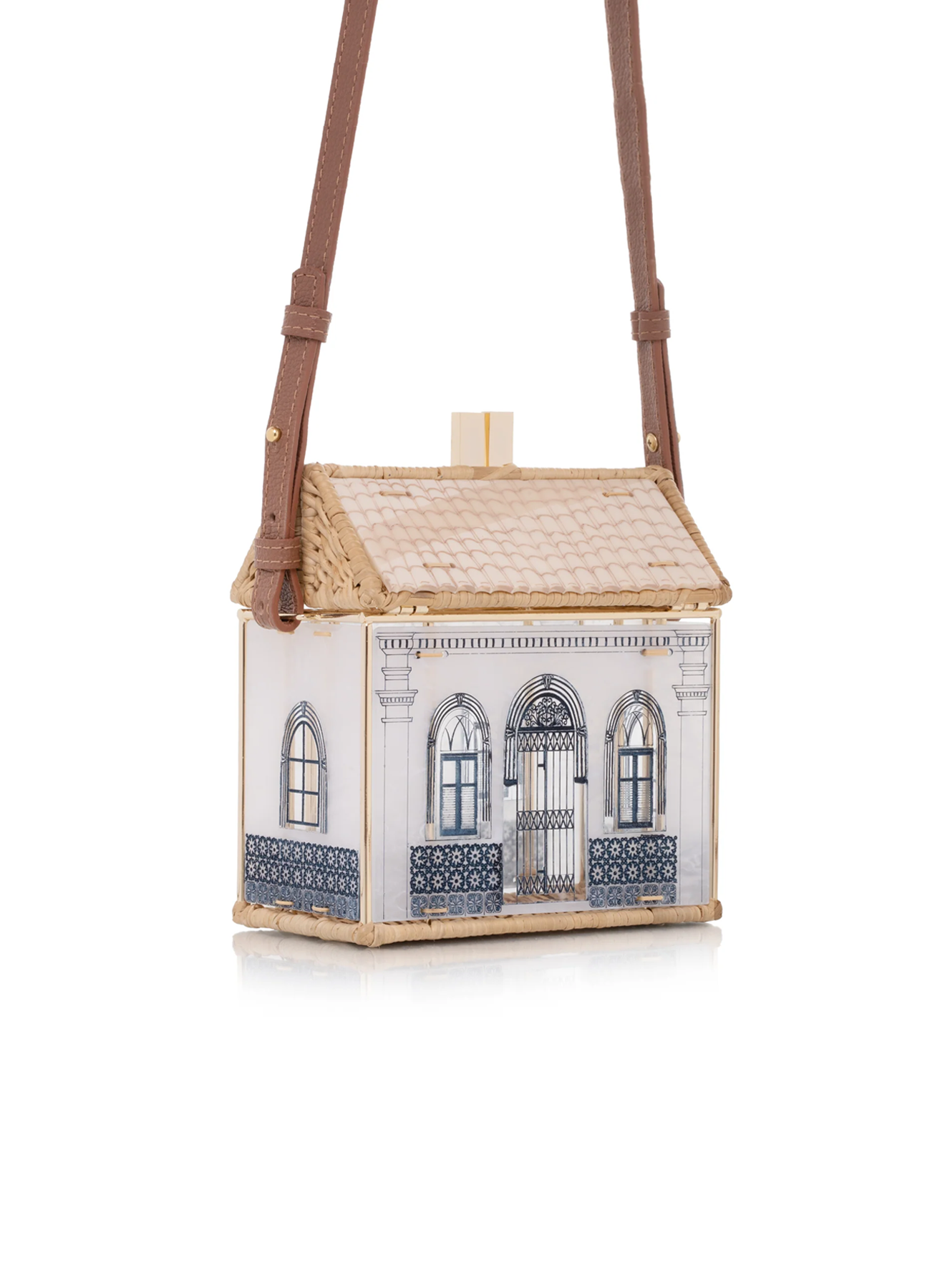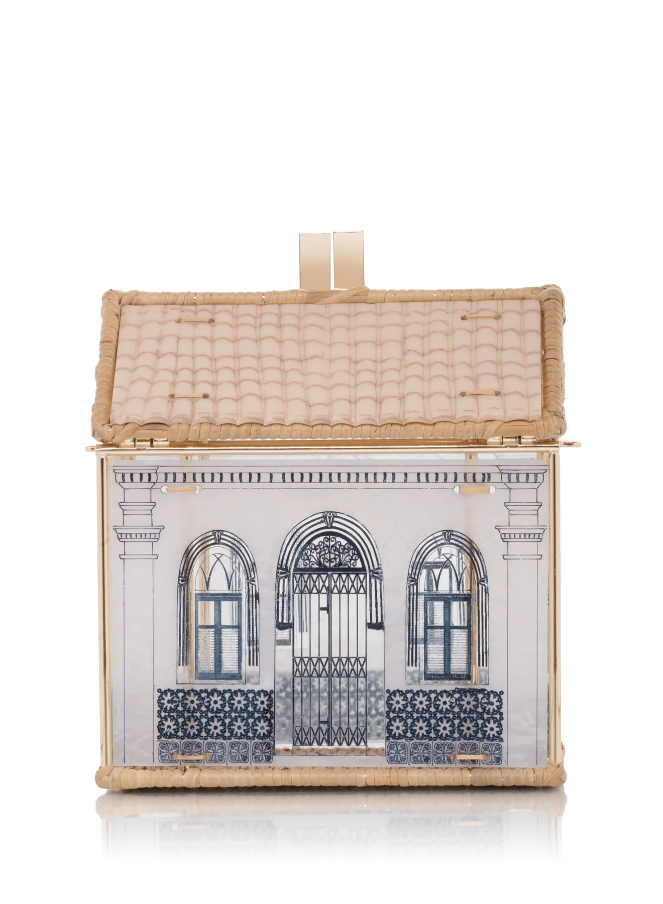 The Uxua Bag Paraty is a standout hexagonal bag with a gold-plated metal frame and handwoven rattan details. It features acrylic panels with typical homes-themed designs and comes with a leather top handle and a detachable strap for versatile wear.