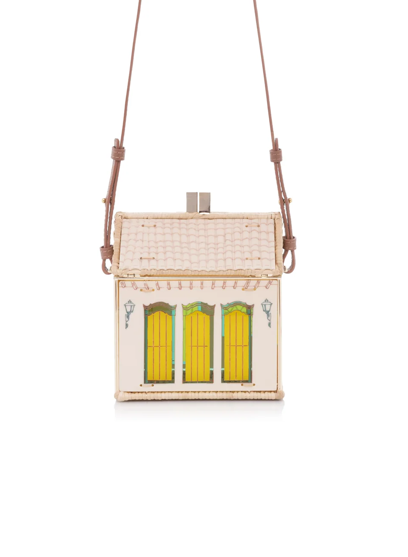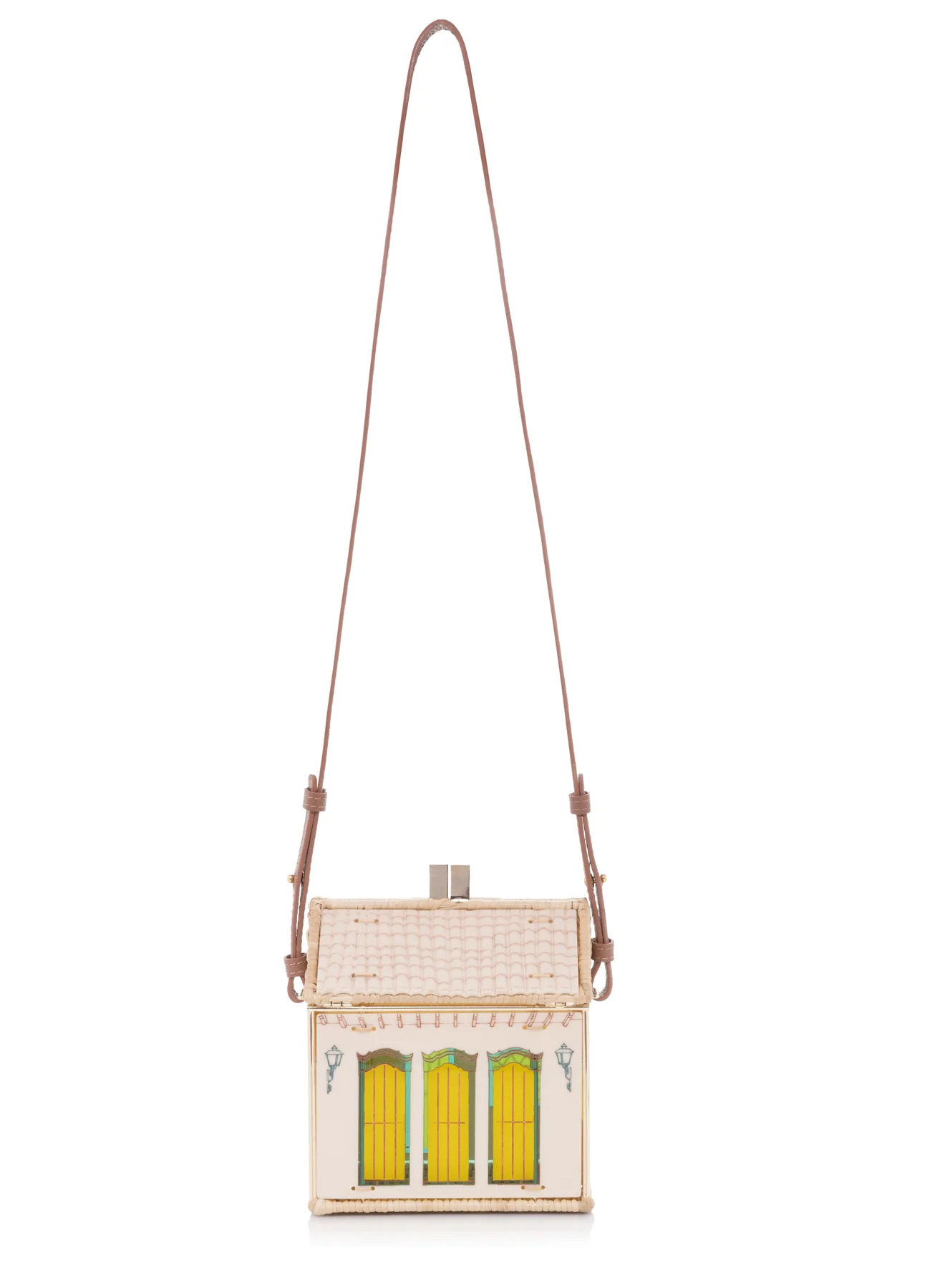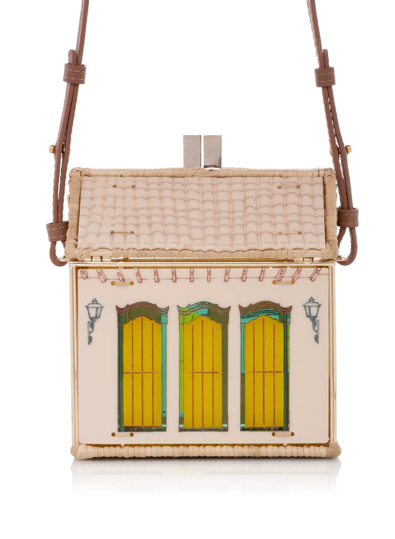 The Uxua Bag Paraty is a standout hexagonal bag with a gold-plated metal frame and handwoven rattan details. It features acrylic panels with typical homes-themed designs and comes with a leather top handle and a detachable strap for versatile wear.