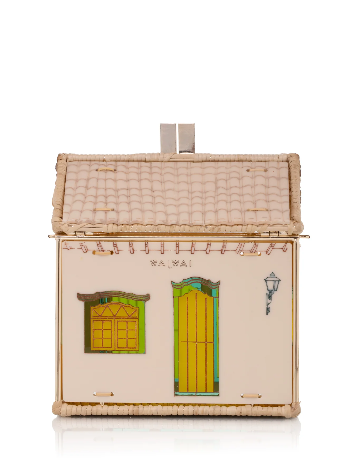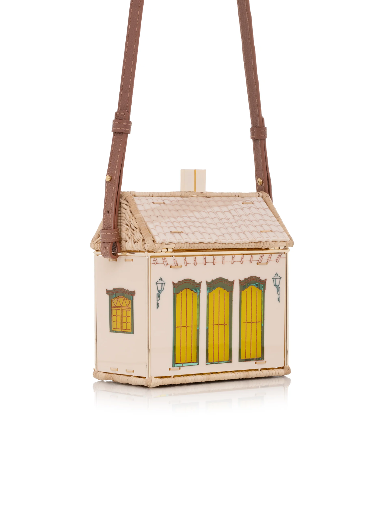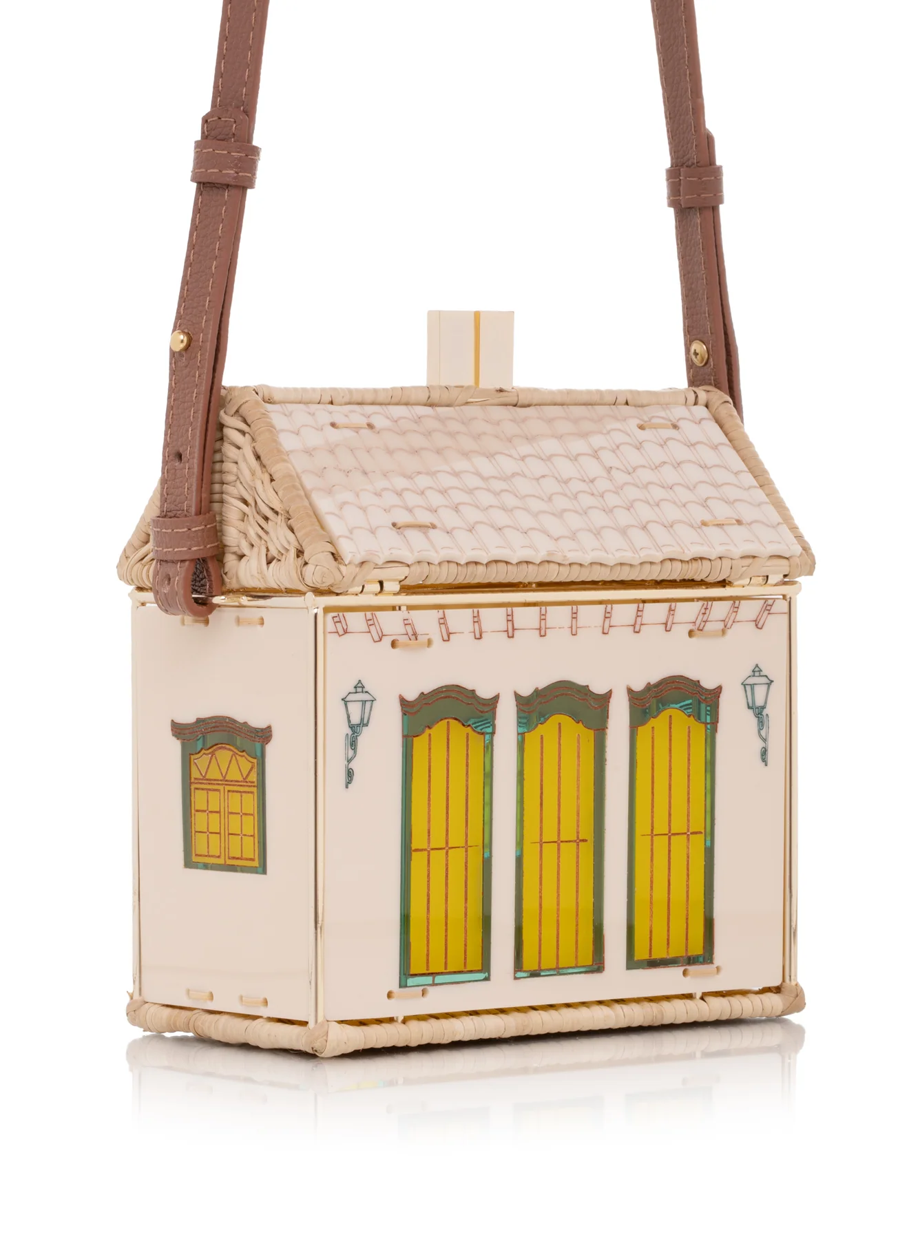 The Uxua Bag Paraty is a standout hexagonal bag with a gold-plated metal frame and handwoven rattan details. It features acrylic panels with typical homes-themed designs and comes with a leather top handle and a detachable strap for versatile wear.