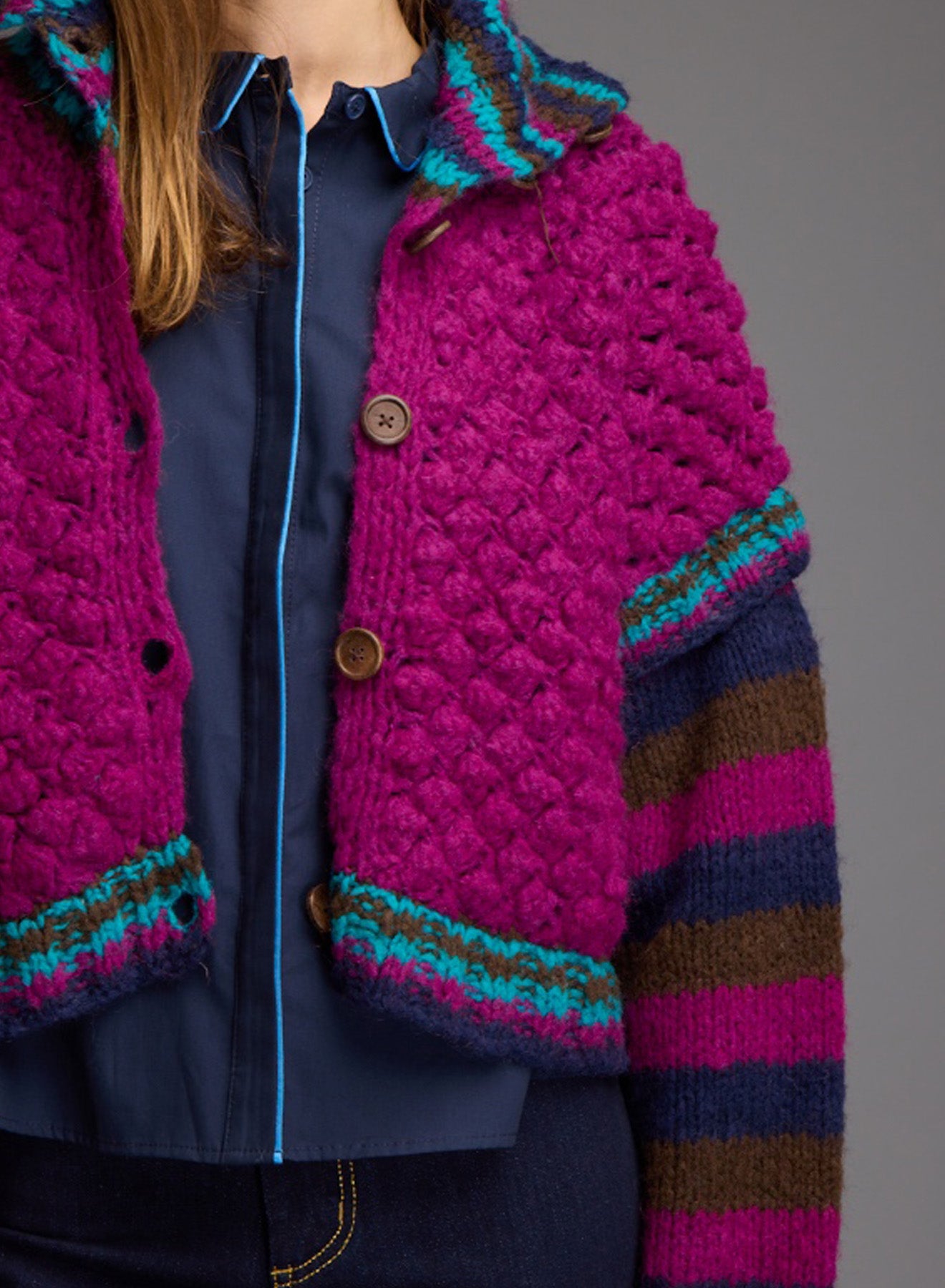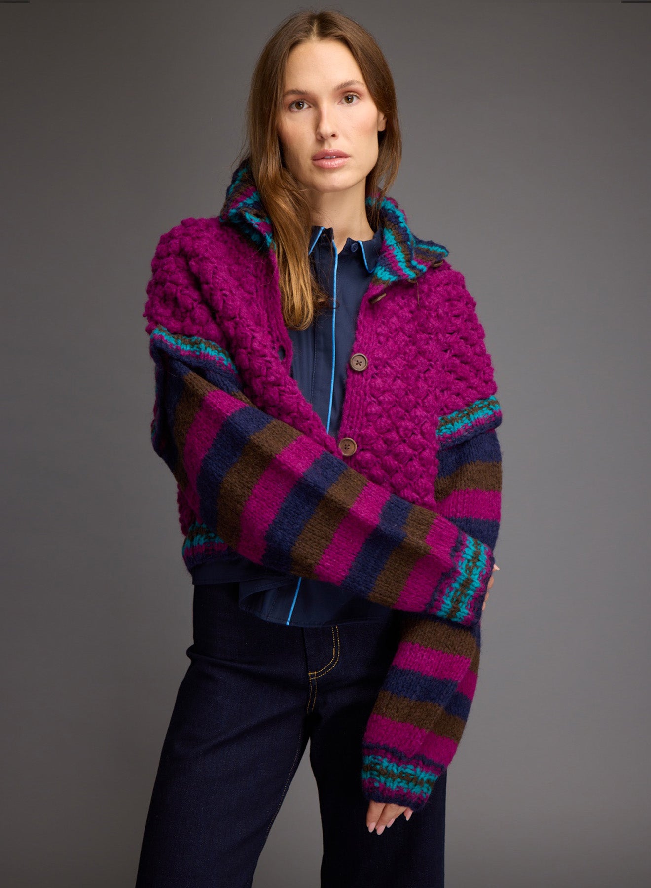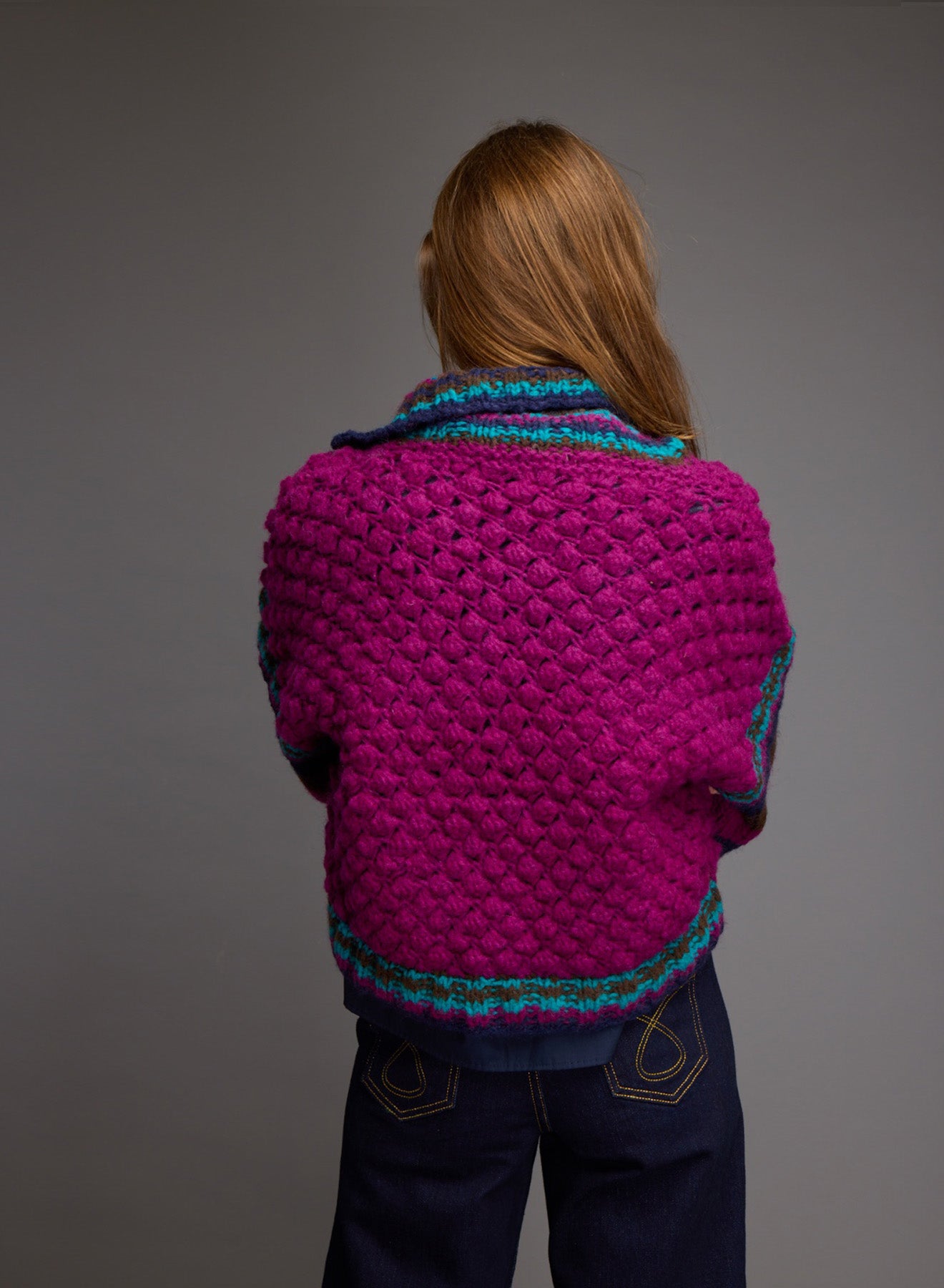 Oversized, hand-knitted cardigan with high collar