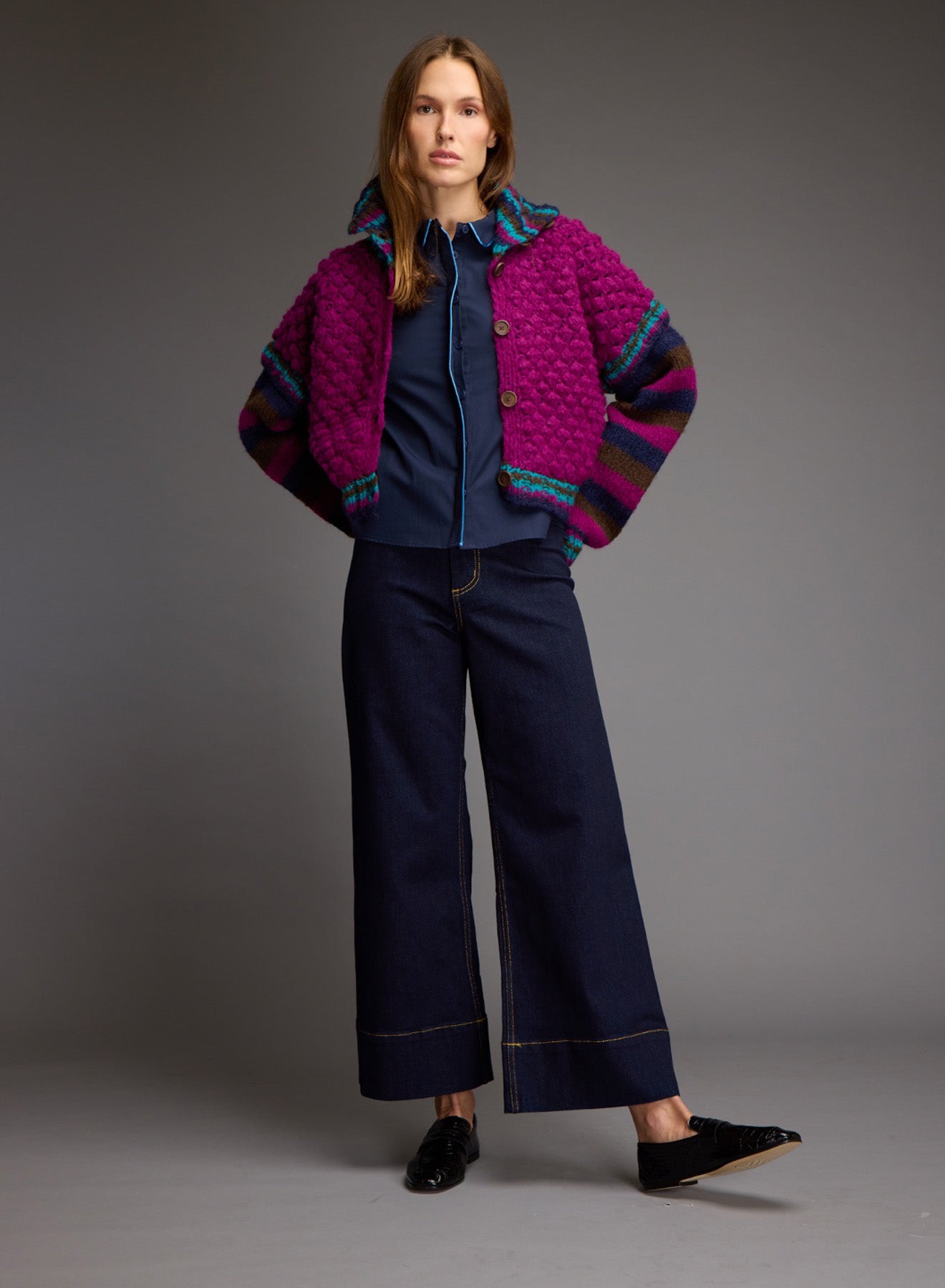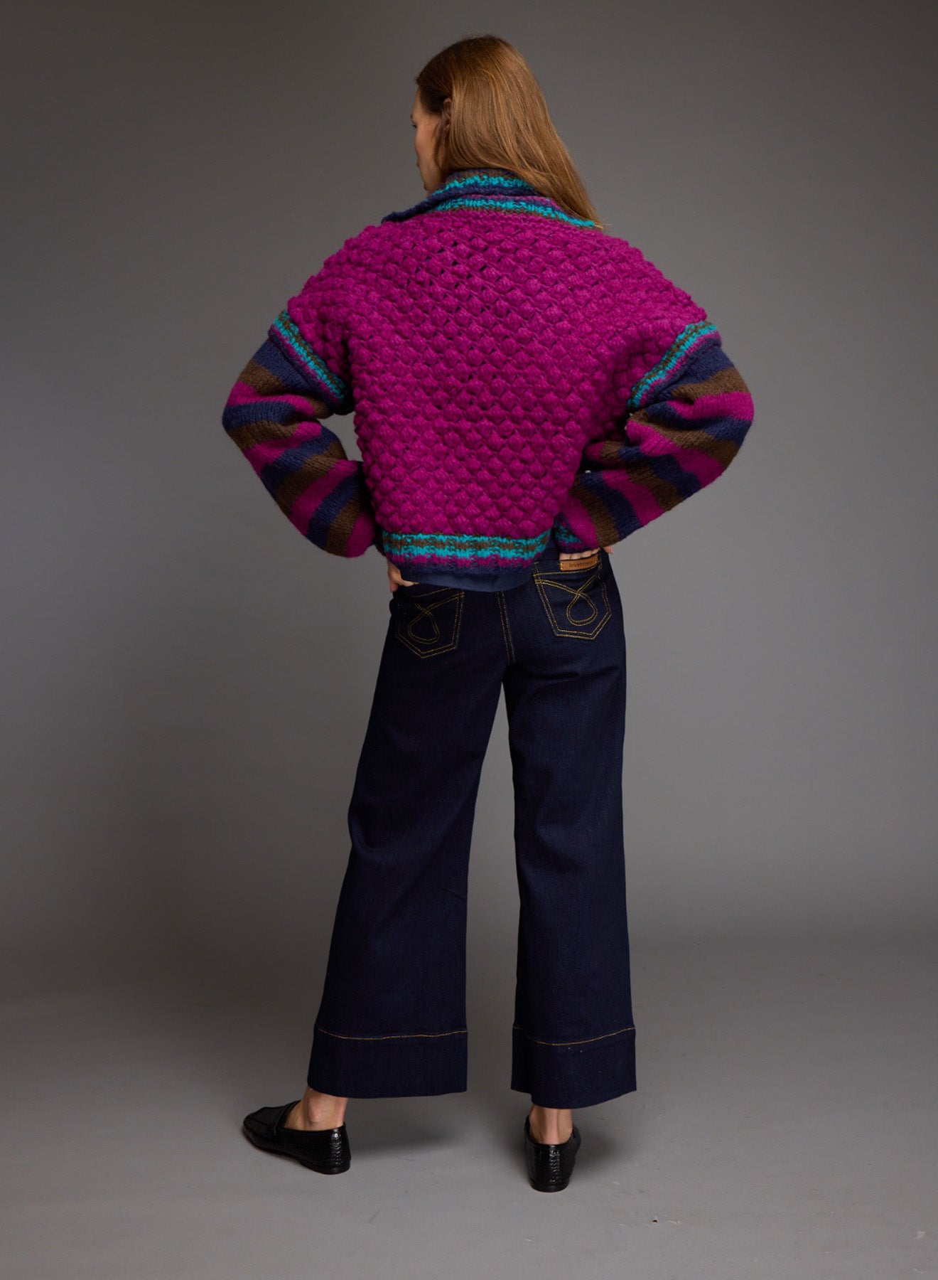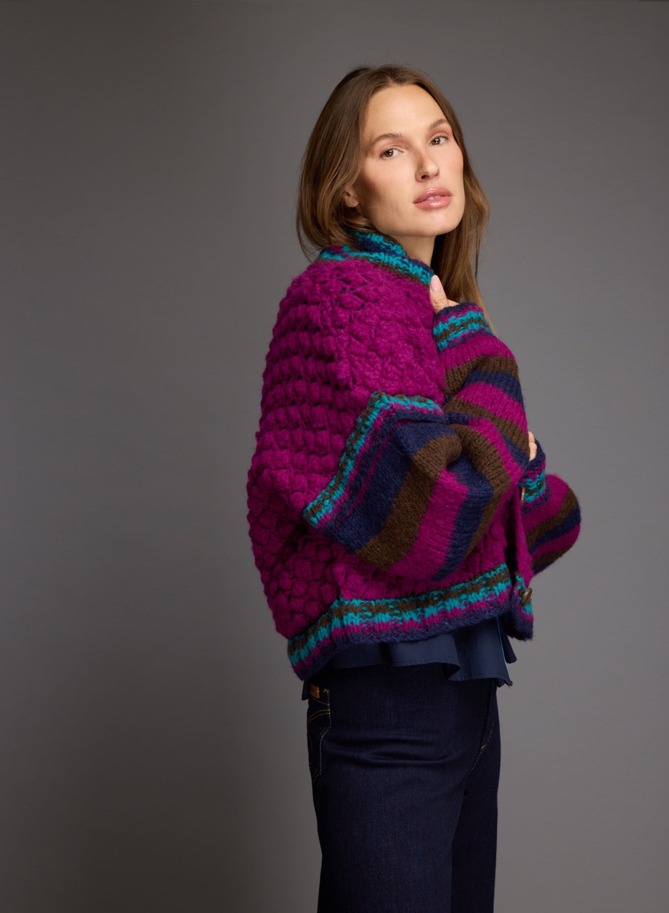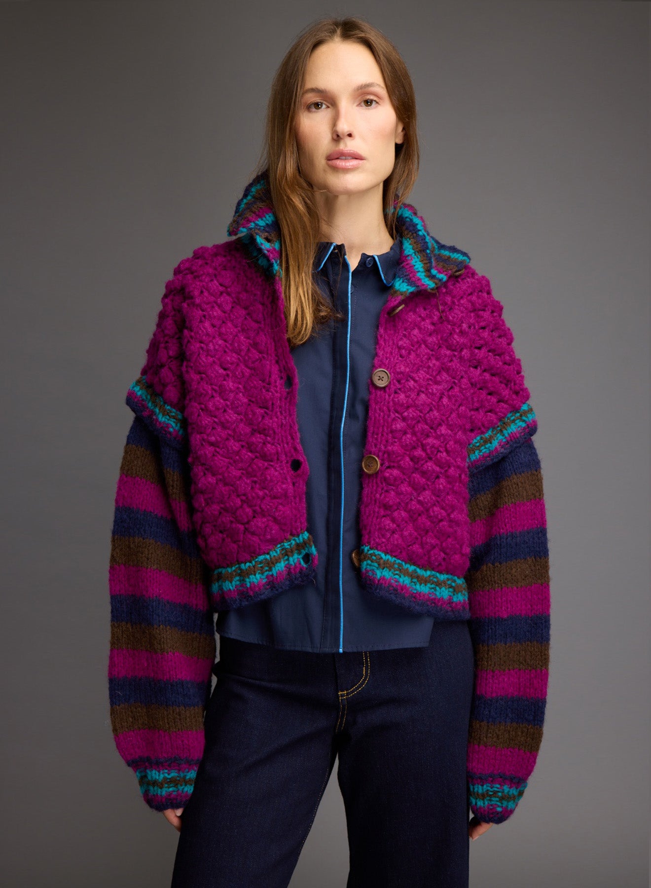 Oversized, hand-knitted cardigan with high collar